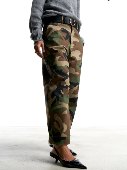 En se révélant en parfaite harmonie avec l'image que l'on se fait de notre look idéal, certaines silhouettes marquent profondément notre bibliothèque intérieure et influencent la composition de nos futures tenues. Je pense tout particulièrement à cette photo de Phoebe Philo en cargo trop grand et en marinière qui m'avait marquée aussi bien pour sa décontraction que pour le subtil détournement des pièces classiques qui y figuraient. Depuis, je guettais le pantalon kaki army que je pourrais porter avec la même aisance... C'est dans ce contexte que ces deux modèles camouflage (voir ici et là) ont retenu mon attention. Il me suffirait en effet de les porter bas sur les hanches (en les choisissant une ou deux tailles au-dessus de ma taille habituelle) et de les retrousser (ou même de les couper) pour que ceux-ci correspondent à l'idée que je me fais du cargo boyish/roots de mes rêves. Je m'imagine déjà l'associer au mix pull rouge ultra douillet/Arizona tabac, au duo tee-shirt blanc/trench camel ou encore à une chemise à fines rayures banquier et à une paire de baskets blanches…