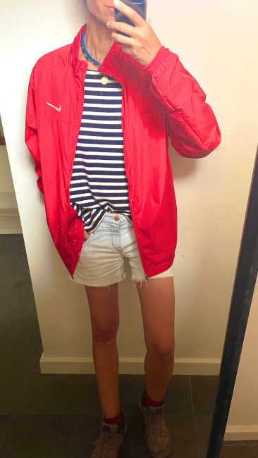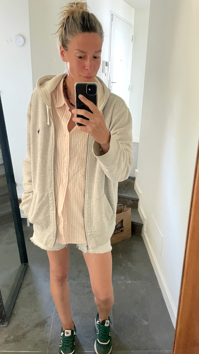 Acheté par Julien en 2011 à Vancouver, ce sweat gris Ralph Lauren était tellement usé aux poignets que son propriétaire décida il y a quelques mois de me le céder et de s'en offrir un neuf. Depuis, ce sweat plébiscité par la griffe Miu Miu lors de son dernier défilé automne/hiver est devenu mon doudou tout terrain. Et force est de reconnaître que j'apprécie autant la sensation physique de confort qu'il me procure que l'image qu'il me renvoie sur les photos. Suffisamment dense pour ne pas faire cheap, assez long pour jouer facilement les blousons de demi-saison et possédant une capuche ayant un minimum de tenue, il s'avère certes moins impactant que le modèle Miu Miu, mais suffisamment pour conférer à mes tenues cette énergie "sporty-boyish" que j'affectionne tant.