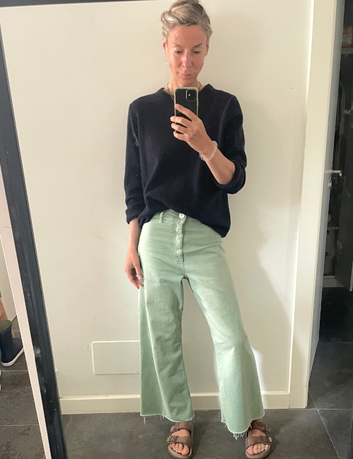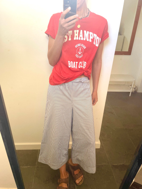 À mi-chemin entre la jupe-culotte et le pantalon large, ces deux pantalons (Zara et J.Crew) sont ceux que je porte le plus et qui - si j'en crois les photos - me vont le mieux. Le fait qu'ils enserrent la taille pour s'évaser ensuite harmonieusement jusqu'en bas du mollet offre en effet à la silhouette une ampleur à la fois nonchalante et maîtrisée (et ce quelle que soit la matière du pantalon). J'aime par ailleurs le fait qu'ils dévoilent la malléole (ce qui permet d'aérer le look), qu'ils m'incitent à porter des tops plus droits qu'amples et que leur tombé - plus féminin que celui d'un chino ou d'un jean boyfriend - insuffle un peu de douceur à mon style "tomboy".