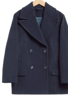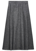 Déboutonner le gilet sur le haut et sur le bas. Remplacer si nécessaire le modèle Acne contre cette pièce moins onéreuse. Ajouter un bonnet gris anthracite les jours de grand froid. Rentrer le tee-shirt dans la jupe.