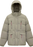 Cintrer la doudoune via le lien de serrage. Ajouter des chaussettes moelleuses rose pâle. Laisser dépasser le col du tee-shirt de celui du pull. Opter pour un chignon coiffé/décoiffé.