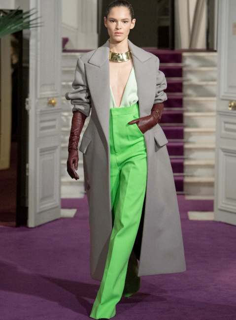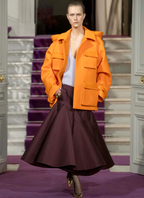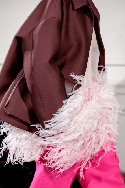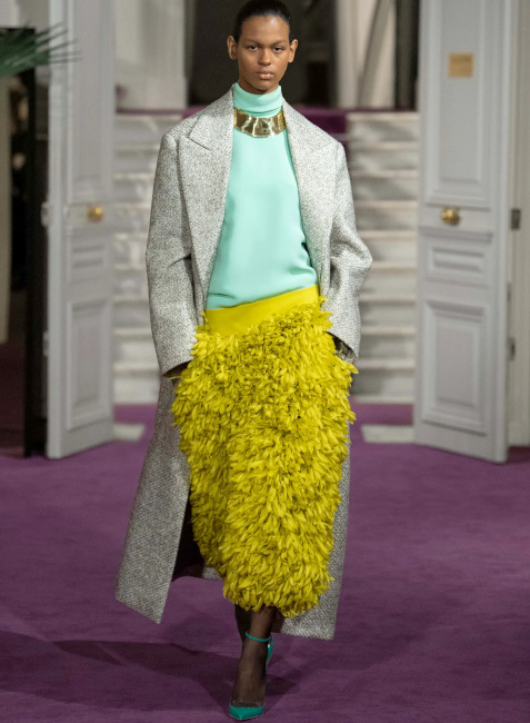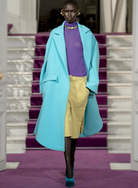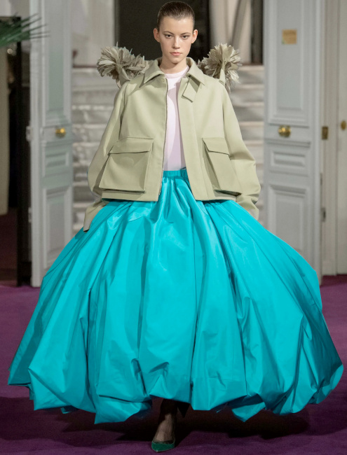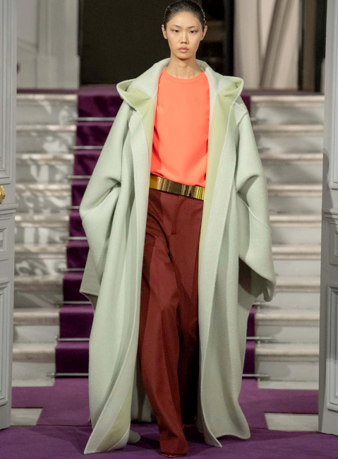 Ici, pas de démonstration de force stérile : la perfection discrète d'un plissé serré générant un tombé à la fois lourd et paradoxalement léger est préférée aux profusions de tulle ou de satin duchesse. Et lorsque des pièces au panache couture (voir ici et là) font leur apparition, c'est pour mieux embrasser un dress code plus "casual" que "tapis rouge". Un "quiet luxury" qui aurait pour une fois oublié d'être insipide. En matière d'élégance, on aurait tôt fait de se réfugier derrière les figures imposées du genre, tant chercher à insuffler un souffle nouveau à celle-ci peut s'avérer ardu, voire risqué. Un risque que Pierpaolo Piccioli prend pourtant sans hésiter. Sous ses doigts, l'universalité de cette notion se voit ainsi revigorée. L'élégance valentinienne s'inscrit dans l'air du temps, sans pour autant être tendance (ce qui la condamnerait à une obsolescence programmée). Les silhouettes s'enchaînent, aussi nonchalamment intemporelles que sublimement contemporaines. En apposant un traitement couture à des éléments classiques (voire basiques), Pierpaolo Piccioli magnifie ce qui pourrait être perçu comme banal et offre à l'ordinaire une expression extraordinaire. Et cela fait mouche : le rêve se tisse sans tenir à distance celui ou celle qui observe ces silhouettes pourtant destinées à une poignée de privilégiés. Le stylisme audacieux - où se télescopent volumes, matières et styles - nous incite à regarder notre propre garde-robe sous un nouvel angle. On pensera ainsi à ceinturer d'or nos pantalons larges marron, à porter nos jupes les plus amples avec un blazer masculin, à laisser une chance aux jupes-culottes et autres pantalons texturés (voir ici et là) que l'on portera de la manière la plus classique possible, à offrir un traitement tailoring à nos jupes Falbala et à apaiser le duo turquoise/violet via un aplat de beige. Les associations de couleurs proposent des variations à la fois subtiles et audacieuses de combos que l'on pensait connaître par coeur. Le duo rose/rouge se mue ainsi en un pétillant tandem rose chimique/lie de vin tirant sur le marron, le mix bleu ciel/marron gagne en vitalité en misant sur une tonalité turquoise et sur des éclats chocolat irisé, tandis que l'harmonie de teintes marron/orange s'adoucit au contact d'une touche de lavande diluée. On pense également au mix vert/marron qui développe une certaine sophistication en allant vers un taupe discret et un vert gazon presque acide. La mise en valeur par Pierpaolo Piccioli des "petites mains" (il déteste l'expression tant il la trouve non adaptée à la valeur des personnes travaillant à l'atelier) qui vinrent saluer à la fin du défilé. Le respect que le créateur italien porte à ces "ouvriers de l'ombre" est palpable et cela fait un bien fou.