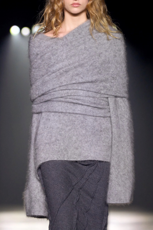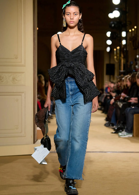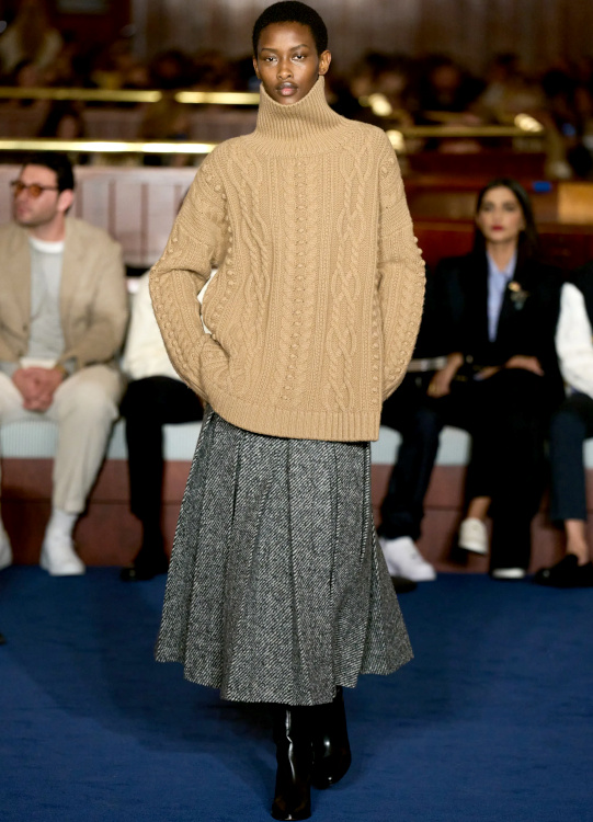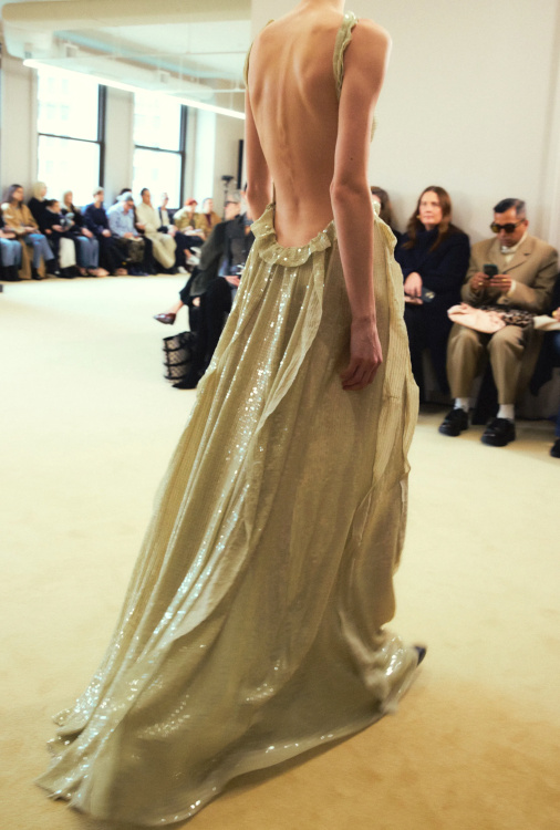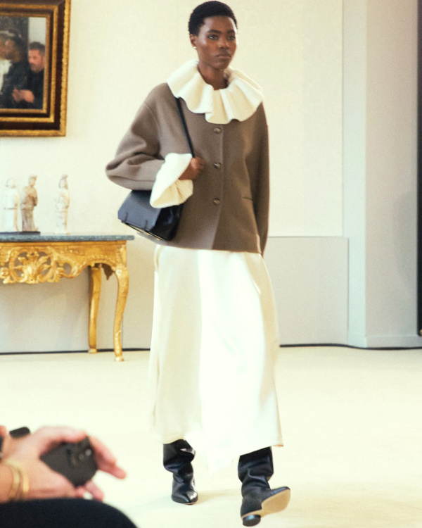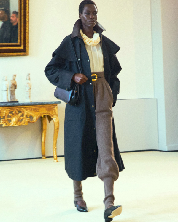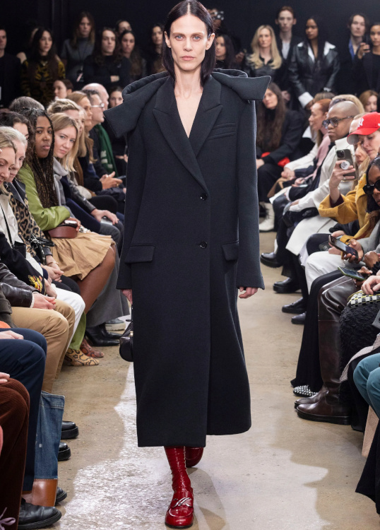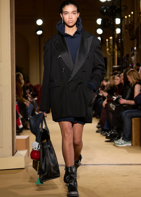La version tricot des knickerbockers ne parvient pas à séduire (Altuzarra). Le bonnet toque ne parvient pas à rivaliser avec l'élégance des modèles Saint Laurent (Altuzarra). Le mix jupe longue mi-mollet/bottes non moulantes continue de parasiter l'allure générale de la silhouette (Altuzarra - voir ici et là). Le dos nu confirme son statut de "game changer" des robes de soirée (Altuzarra - voir ici et là). Le duffle-coat confirme son retour sur le devant de la scène (Altuzarra). Le pantalon d'équitation non revisité tente de profiter de la mouvance "sport chic" du moment pour s'imposer comme le nouveau slim (Altuzarra). S'inspirer de Marc Jacobs n'a jamais été aussi dans l'air du temps (Marc Jacobs 2008, Altuzarra). Si caster uniquement des femmes de plus de 40 ans est bienvenu, leur faire porter des vêtements les mettant en valeur serait également une bonne idée (Batsheva - voir ici et là). Contrairement à ce que certains pourraient penser, reprendre un gimmick ayant rencontré un certain succès chez un concurrent n'est pas nécessairement gage de réussite. Le duo sweat/blazer vu chez Miu Miu en 2023 a ainsi beau sembler "simple" sur le papier, son caractère unique et infiniment désirable s'explique en réalité avant tout par la présence de nombreux détails (de la matière du sweat aux jeux de teintes, en passant par la coupe du blazer). Des détails que l'on ne retrouve malheureusement pas chez Coach... Le version prêt-à-porter du style grunge "vivienne westwoodien" laisse de marbre (Coach).
