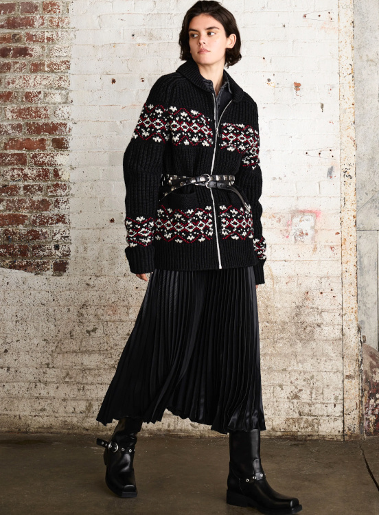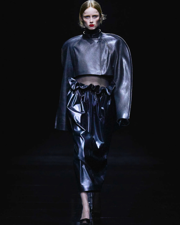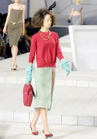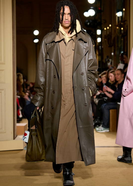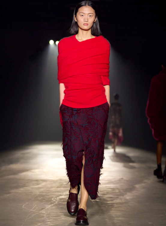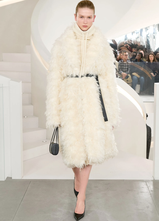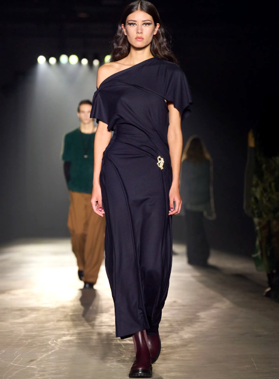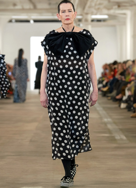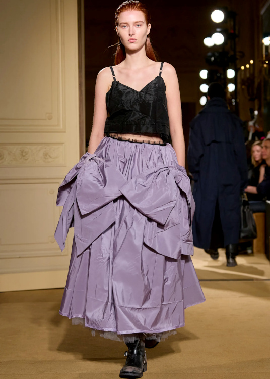 La version tricot des knickerbockers ne parvient pas à séduire (Altuzarra). Le bonnet toque ne parvient pas à rivaliser avec l'élégance des modèles Saint Laurent (Altuzarra). Le mix jupe longue mi-mollet/bottes non moulantes continue de parasiter l'allure générale de la silhouette (Altuzarra - voir ici et là). Le dos nu confirme son statut de "game changer" des robes de soirée (Altuzarra - voir ici et là). Le duffle-coat confirme son retour sur le devant de la scène (Altuzarra). Le pantalon d'équitation non revisité tente de profiter de la mouvance "sport chic" du moment pour s'imposer comme le nouveau slim (Altuzarra). S'inspirer de Marc Jacobs n'a jamais été aussi dans l'air du temps (Marc Jacobs 2008, Altuzarra). Si caster uniquement des femmes de plus de 40 ans est bienvenu, leur faire porter des vêtements les mettant en valeur serait également une bonne idée (Batsheva - voir ici et là). Contrairement à ce que certains pourraient penser, reprendre un gimmick ayant rencontré un certain succès chez un concurrent n'est pas nécessairement gage de réussite. Le duo sweat/blazer vu chez Miu Miu en 2023 a ainsi beau sembler "simple" sur le papier, son caractère unique et infiniment désirable s'explique en réalité avant tout par la présence de nombreux détails (de la matière du sweat aux jeux de teintes, en passant par la coupe du blazer). Des détails que l'on ne retrouve malheureusement pas chez Coach... Le version prêt-à-porter du style grunge "vivienne westwoodien" laisse de marbre (Coach).