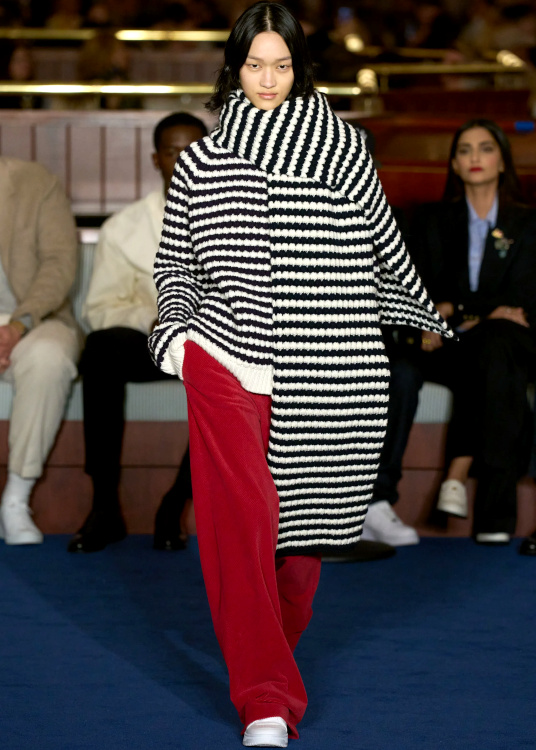 Autrefois déconseillée, l'association du noir et du bleu marine est désormais autorisée, à condition toutefois de jouer sur les textures pour en garantir l'harmonie. Il est regrettable que Jack McCollough et Lazaro Hernandez n'aient semblé saisir ce principe que par intermittence (Proenza Schouler - voir ici et là). Trouver un nouveau concept est une chose, parvenir à en livrer une version aboutie en est une autre… (Proenza Schouler - voir ici et là) Le travail de déconstruction de Chitose Abe chez Sacai (voir ici et là) semble avoir inspiré Rag & Bone. Les soeurs Olsen connaissent leurs classiques, comme nous le prouve cette réinterprétation de ce coupe-vent Céline A/H 2016. En ne parvenant pas à équilibrer correctement certaines de ses silhouettes, Tommy Hilfiger amoindrit considérablement leur portée (voir ici, ici et là). Chez Rag & Bone, les santiags à bouts carrés participent à un cadavre exquis qui ne manque pas d'attrait, entre jupe plissé mi-longue et gilet esprit montagne (voir ici). Le tandem maxi écharpe rayée/pull coordonné fait mouche (Tommy Hilfiger).