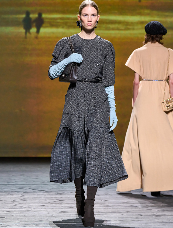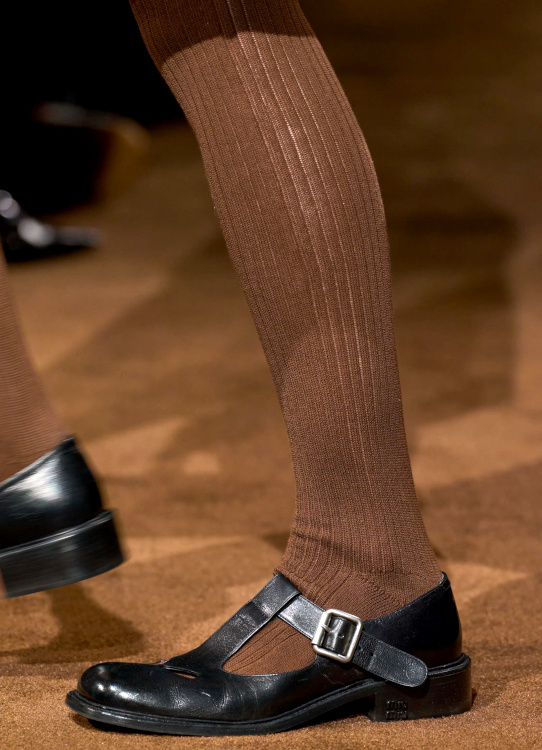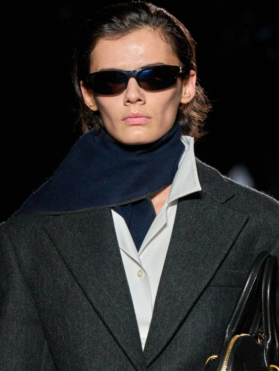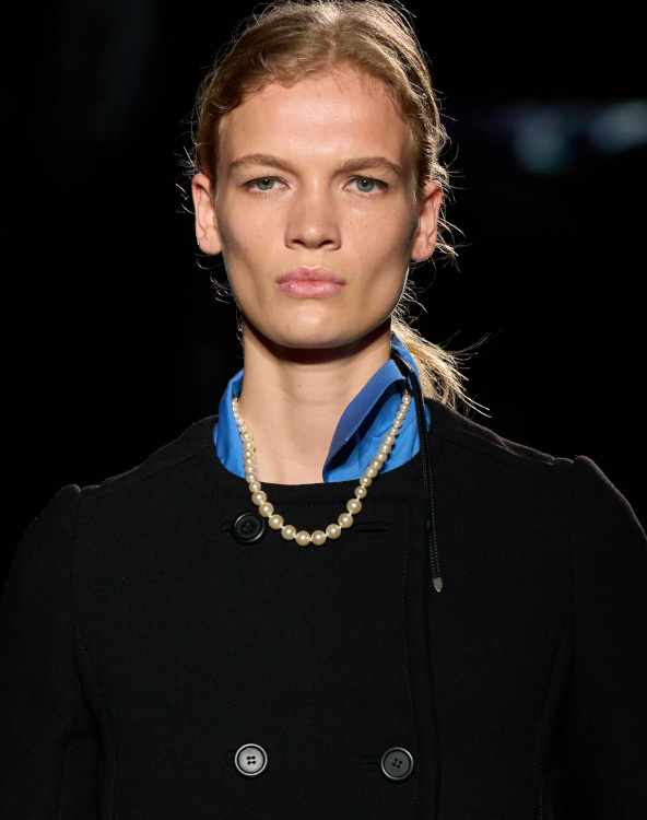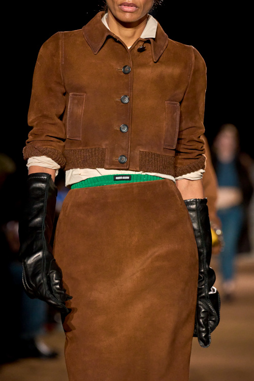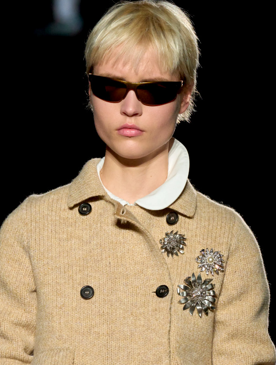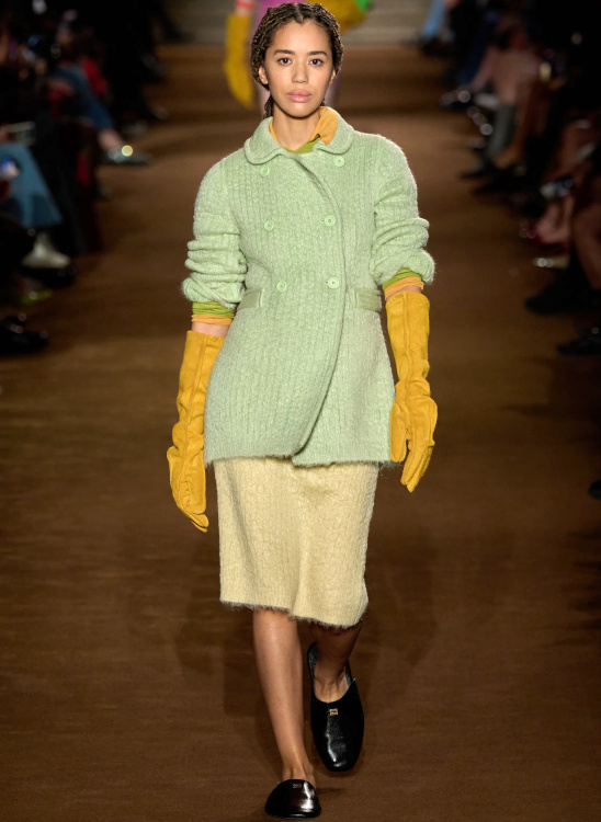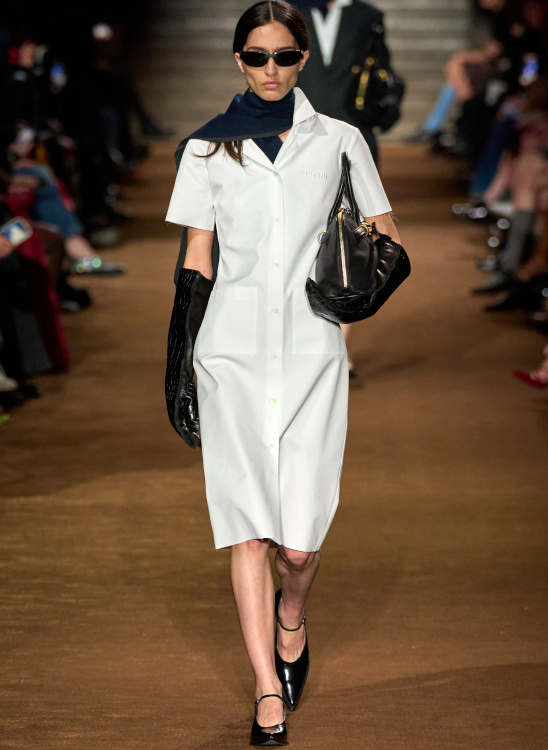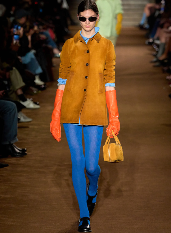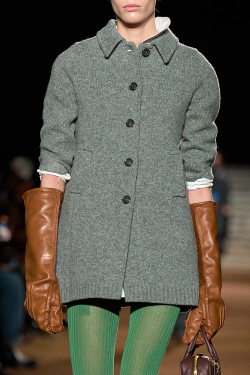 Chez Miu Miu, le court-métrage réalisé par l'artiste Cécile B. Evans évoque l'éventualité de la perte des souvenirs que nous stockons par milliers dans des banques de données finalement assez vulnérables. Des souvenirs - tour à tour intimes ou universels - qui ressurgissent ici par touches au fil des passages, entre la taille basse des années 2010, le cuir suédé brodé cher à la créatrice, l'esprit Marc Jacobs 2008 (Miu Miu, Marc Jacobs), les blouses d'un autre âge, le sourire d'une actrice dans un vieux film italien, les gants Miu Miu de 2017 (voir ceux de 2024) ou encore les collants en laine réchauffant nos genoux de petite fille… Au sein de la ligne bis de chez Prada, ce sont davantage des détails qu'une silhouette en particulier que l'on retiendra, à l'instar du col de chemise relevé asymétriquement, des longs gants esthétisant ceux que l'on utilise pour sortir le gigot du four, des broches épinglées sur un cardigan, de l'élégant mix gris/vert menthe/alezan, des godillots à moitié lacés, de l'écharpe à demi glissée sous la chemise ou encore du vivifiant combo bleu azur/orange/fauve.