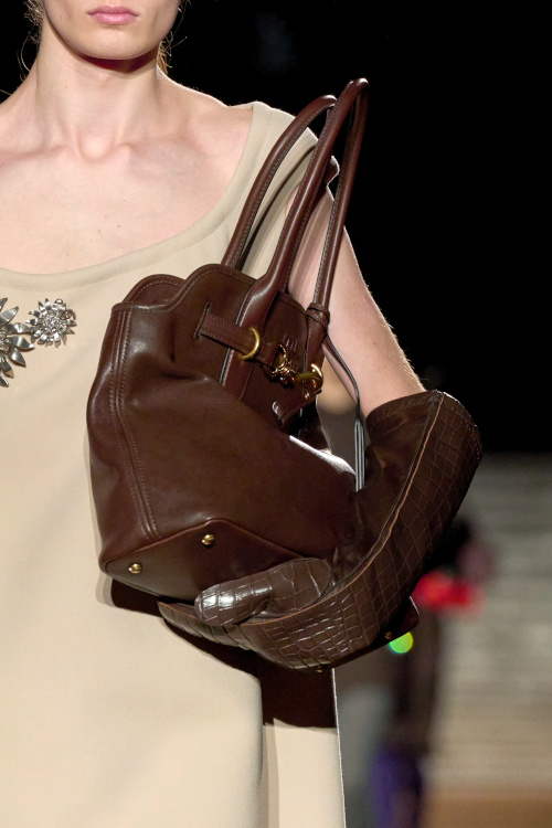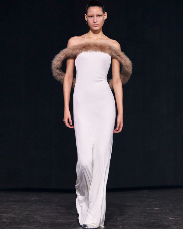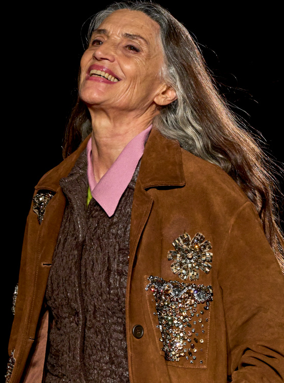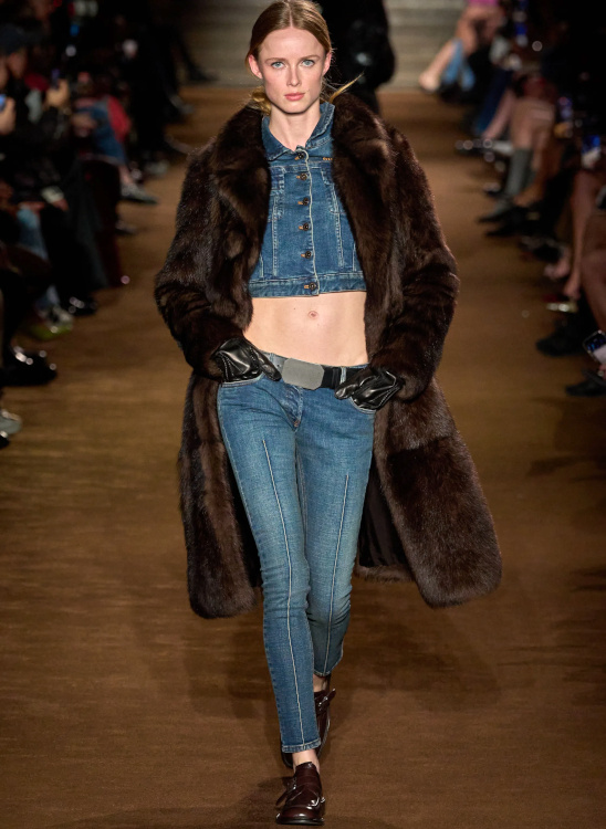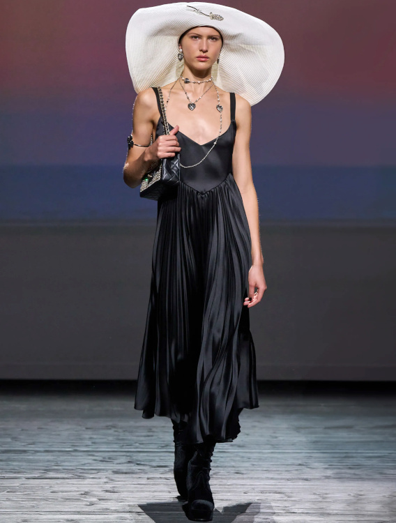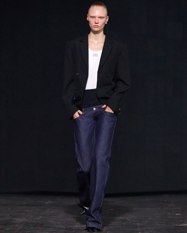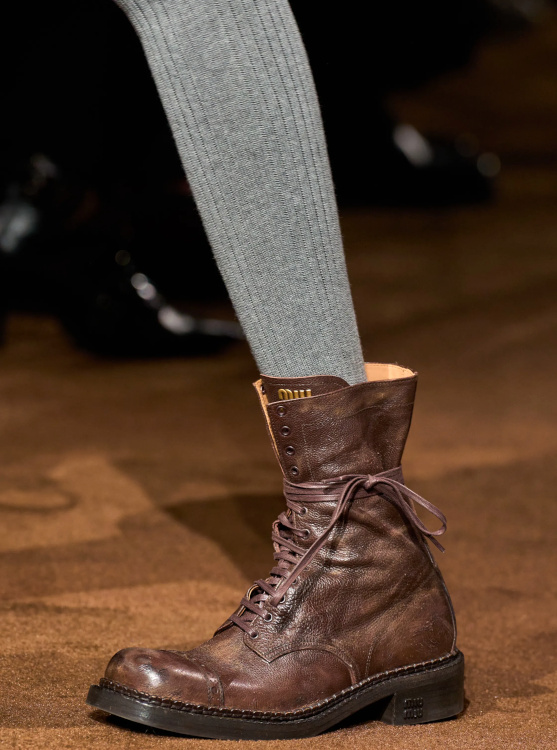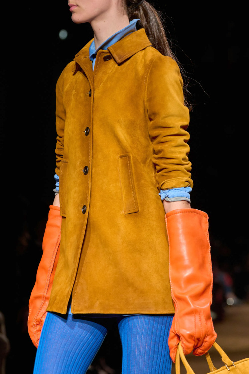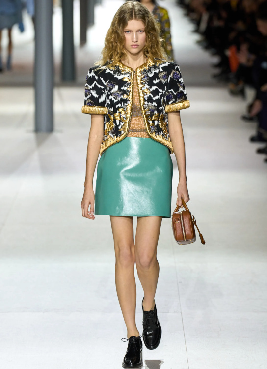 Chez Miu Miu, le court-métrage réalisé par l'artiste Cécile B. Evans évoque l'éventualité de la perte des souvenirs que nous stockons par milliers dans des banques de données finalement assez vulnérables. Des souvenirs - tour à tour intimes ou universels - qui ressurgissent ici par touches au fil des passages, entre la taille basse des années 2010, le cuir suédé brodé cher à la créatrice, l'esprit Marc Jacobs 2008 (Miu Miu, Marc Jacobs), les blouses d'un autre âge, le sourire d'une actrice dans un vieux film italien, les gants Miu Miu de 2017 (voir ceux de 2024) ou encore les collants en laine réchauffant nos genoux de petite fille… Au sein de la ligne bis de chez Prada, ce sont davantage des détails qu'une silhouette en particulier que l'on retiendra, à l'instar du col de chemise relevé asymétriquement, des longs gants esthétisant ceux que l'on utilise pour sortir le gigot du four, des broches épinglées sur un cardigan, de l'élégant mix gris/vert menthe/alezan, des godillots à moitié lacés, de l'écharpe à demi glissée sous la chemise ou encore du vivifiant combo bleu azur/orange/fauve.