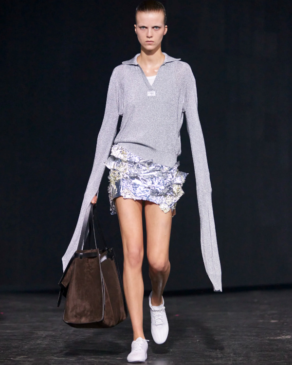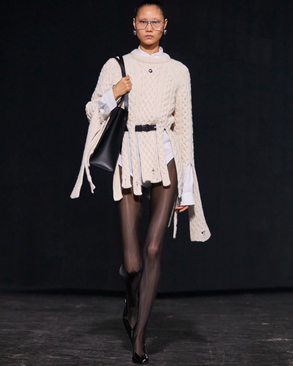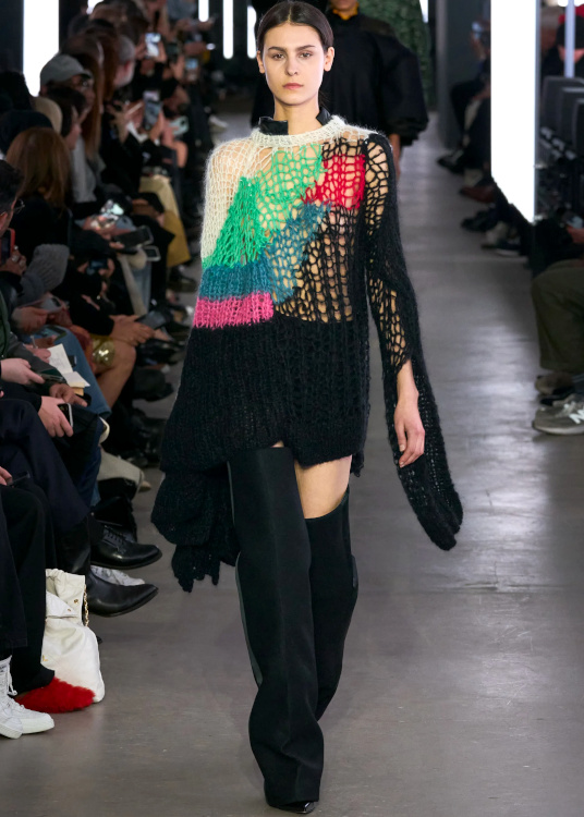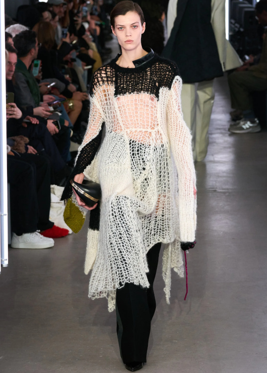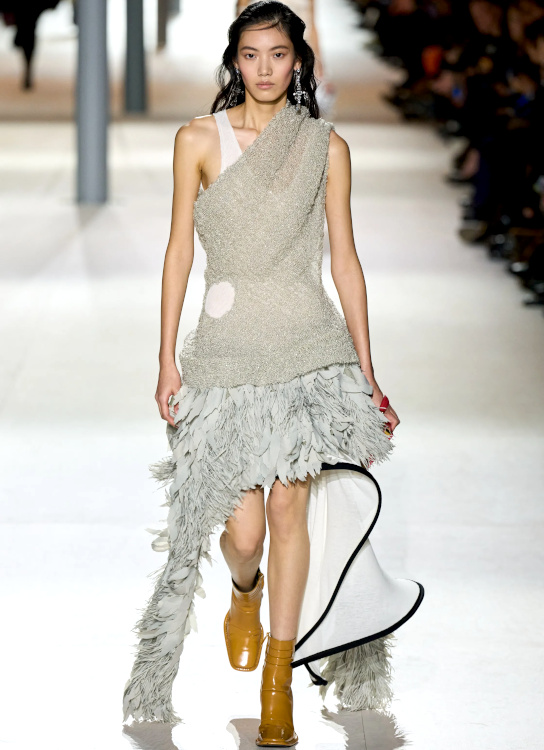 Qin Huilan (alias @i_doctor_qin) défila chez Miu Miu (voir ici). Virginie Viard s'autorise peu à peu à se détacher de l'ombre de Karl Lagerfeld pour livrer sa propre vision de l'univers Chanel. Et si les looks semblent dans leur majorité alourdis par un héritage encombrant, certaines silhouettes n'en laissent pas moins entrevoir une douceur inédite (voir ici, ici et là). Du show Coperni, on retiendra que le ziploc est appelé à devenir le meilleur ami du sac à main, que la taille basse confirme son come-back, que le papier d'aluminium revendique son statut de matière chic à part entière et que la cote du duffle-coat connaît une embellie. Et qu'à défaut de connaître le sexe des anges, on sait désormais que leur auréole est joyeusement velue. Réinventer son pull irlandais en mode DIY pourrait bien devenir le nouveau passe-temps à la mode (Coperni, Sacai, Stella McCartney). Les tricots Sacai ne sont pas sans rappeler les expérimentations hasardeuses des soeurs Mulleavy (voir ici et là).
