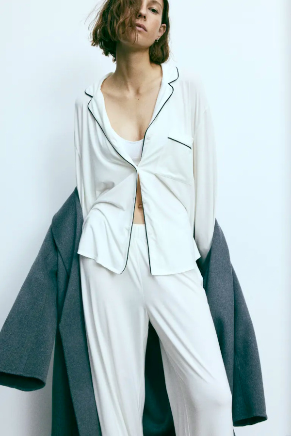 Pour finir, si les larges rayures matelas seront à réserver aux expertes du détournement, il y a en réalité peu d'interdits en matière de teintes et de graphismes (cela dépendra surtout des goûts de chacun et de la manière d'associer cette fameuse chemise de pyjama à sa garde-robe). Cela étant dit, celles qui voudront éviter toute prise de risque se dirigeront de préférence vers des modèles à fines rayures ou vers des pièces unies ourlées par un point de feston contrastant (il leur suffira ensuite d'aller vers des tonalités qu'elles ont l'habitude de manier).
