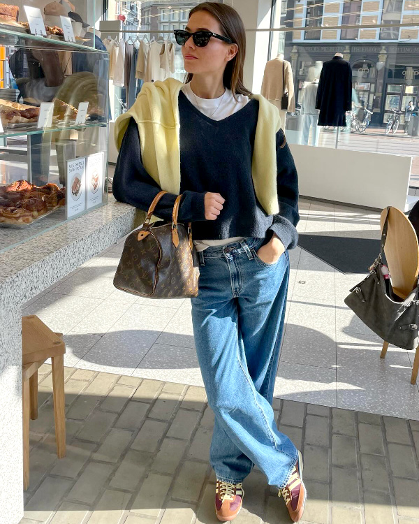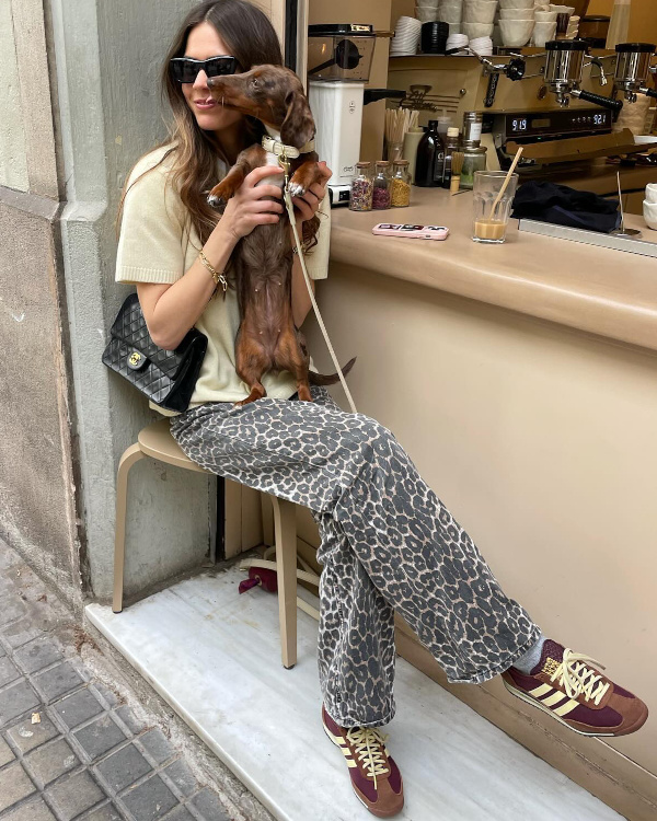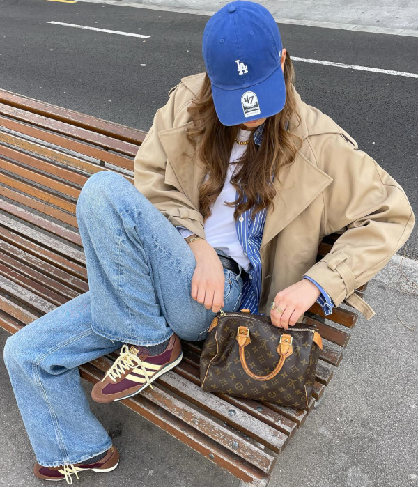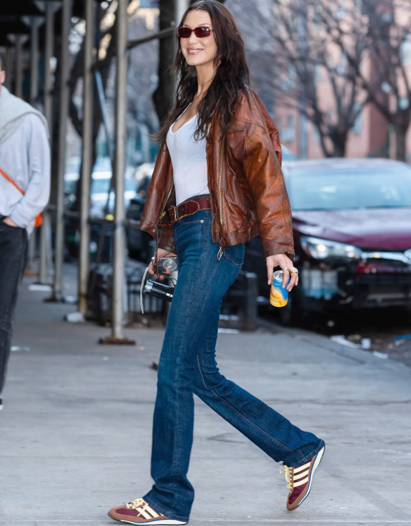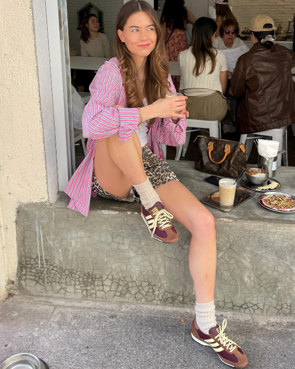 Lancées en 1972, ces baskets furent initialement conçues pour les athlètes des Jeux olympiques de Munich. L'acronyme "SL" signifie "Super Light" : mixant daim et nylon de manière innovante, ces chaussures offrent à la fois durabilité et confort tout en conservant une structure extrêmement légère (ce qui s'apparente à l'époque à une petite révolution). Adidas profita du lancement de sa SL pour introduire la nouvelle technologie de semelle "Torsion System". Boostant la stabilité de la basket, cette dernière se révèle être un atout de taille pour améliorer les performances des athlètes. Rapidement séduits par sa légèreté et sa stabilité, les skateurs en firent l'une de leurs baskets de prédilection. Dans les années 90, la SL 72 profite de l'engouement général envers les sneakers pour accroître sa popularité. Elle devient ainsi un modèle iconique qu'Adidas n'hésite pas à rééditer régulièrement en jouant avec les coloris et les textures. Le succès de la SL 72 eut un impact significatif sur le design des modèles proposés par la suite par l'équipementier allemand. De nombreux éléments - tels que sa forme élancée et sa semelle innovante - furent ainsi repris et adaptés au sein de plusieurs baskets. En août 2023, elles sont aperçues aux pieds d'Alexa Chung. Le 9 février 2024, c'est au tour de Bella Hadid de les arborer. Depuis, la SL 72 connaît un nouvel âge d'or auprès des trendsetteuses. Il faut dire qu'avec son style rétro plus pointu que celui de la sempiternelle Samba et ses coloris pile dans l'air du temps (le mix marron/prune/jaune n'est pas sans évoquer la palette chromatique de la collection Miu Miu P/E 2024), elle est une parfaite alternative à la tendance ballerines. Si le modèle marron est aujourd'hui le plus en vogue, les déclinaisons misant sur les camaïeux de verts ou sur des combos fleurant bon les seventies (voir ici et là) ne manquent également pas de charme. Point de vue dress code, on note qu'elle aime particulièrement la compagnie des chemises à rayures verticales (voir ici et là), qu'elle apprécie de retrouver une ou deux de ses teintes au sein du look auquel elle participe (voir ici et là), qu'elle fonctionne bien avec du léopard, qu'elle s'avère idéale pour twister de manière subtile un look classique et qu'elle sera parfaite associée à un baggy ou à un jean flare.