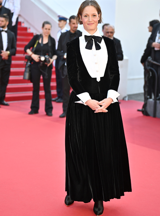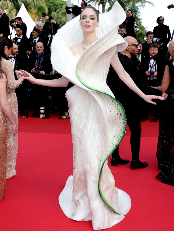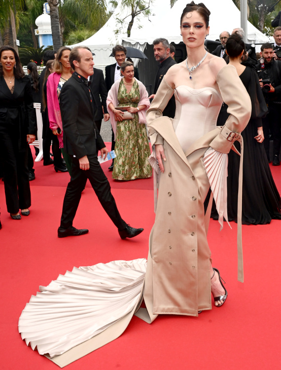 Opter pour l'éclat d'une robe à sequins afin de compenser un style capillaire naturel et une absence d'accessoires peut s'avérer judicieux, à condition que la coupe de ladite robe ne soit pas soporifique (Chiara Mastroianni en Céline). Entre escarpins bicolores, coupe de cheveux moyenâgeuse et robe scintillante semi-rigide au décolleté non assumé (Louis Vuitton), Marina Foïs aurait dû choisir. La beauté aristocratique de Charlotte Casiraghi ferait presque oublier l'étrangeté de sa toilette Chanel (voir ici). Ne jamais oublier que rose pâle et orange scintillant sont faits pour vivre ensemble (Lou Lampros en Chanel) ! Cate Blanchett et Bella Hadid affichèrent plus ou moins subtilement leurs opinions politiques. Que l'on l'apprécie ou non, force est de constater que Bella Hadid maîtrise l'art du glamour comme peu de jeunes femmes de sa génération. En misant sur des toilettes ultra sensuelles tout en conservant une attitude glacialement hollywoodienne, la mannequin réussit le tour de force de ne jamais apparaître vulgaire. À une exception près… La robe Saint Laurent arborée par la jeune femme lors de sa montée des marches pour le film "The Apprentice" ne servit en effet pas son allure (voir ici, ici et là). Entre effet collant chair peu galvanisant, transparence gratuite et dégaine globale évoquant le visage masqué d'un braqueur de banque, cette création Anthony Vaccarello aurait mieux dû rester à Paris... Avec ses 16% d'augmentation de chiffre d'affaires en 2023, la maison Chanel ne sera pas incitée à chercher un nouveau DA. Dommage… (voir ici, ici et là) Les manches fendues longuissimes et autres traînes de poignets confèrent aux robes une allure médiévale follement pragmatique (voir ici et là). Les toilettes Vivienne Westwood s'obstinent à arborer une longueur mi-mollet (ou cheville) qui n'a rien de flatteur (Candice Swanepoel, Lena Situation). Le hair code "princesse Leia" continue d'inspirer certains coiffeurs… (voir ici)