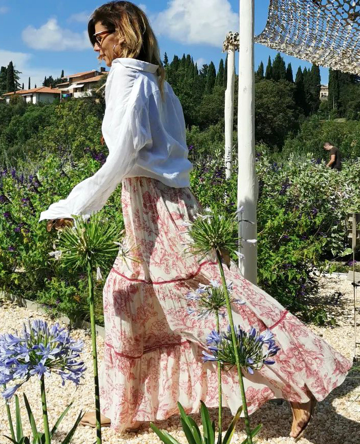 Connue notamment pour avoir organisé le mariage de Chiara Ferragni, Alessandra Grillo incarne à la perfection l'image de l'Italienne glamour et naturelle, espiègle et sensuelle, audacieuse et joyeuse. Passage en revue de ce que l'on pourra emprunter à la grammaire stylistique de celle qui ne jure que par Dolce & Gabbana, l'imprimé bandana et les virées en voilier sur la Méditerranée…