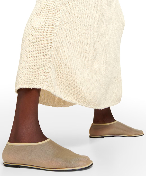 Persuadée dans un premier temps qu'une création aussi peu flatteuse resterait lettre morte, j'ai observé avec fascination sa montée en puissance. En distribuant ces chaussures aux influenceuses qui façonnent les désirs des utilisatrices d'Instagram, la marque Khaite (entre autres) est en effet parvenue à faire du filet de pied un must-have : de Bottega Veneta à Alaïa en passant par The Row, on ne compte plus les griffes ayant troqué leurs tiges en cuir contre une texture aérée qui, une fois au contact des orteils, n'est pas sans évoquer certains produits de charcuterie...