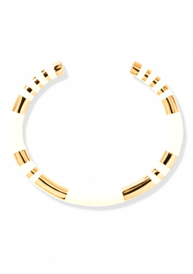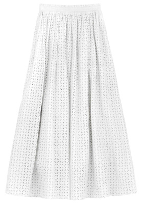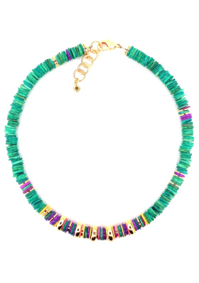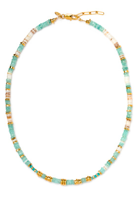 Jouer avec la teinte du collier pour rehausser celle du tee-shirt. Nouer ses cheveux en une queue de cheval basse placée sur le côté. L'idée est ici de profiter de la taille haute de la jupe pour pouvoir porter du cropped sans dévoiler la totalité du ventre.