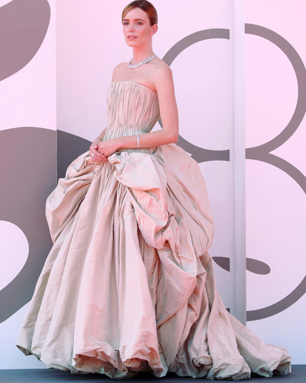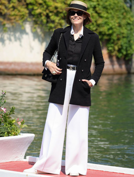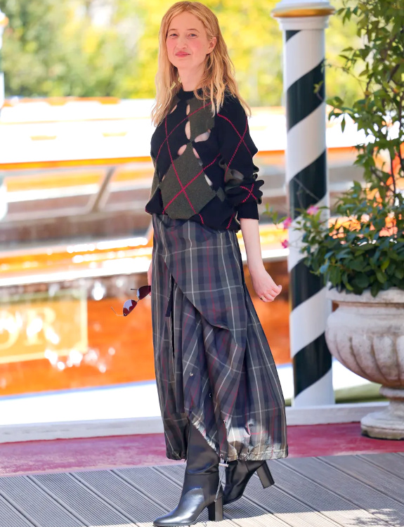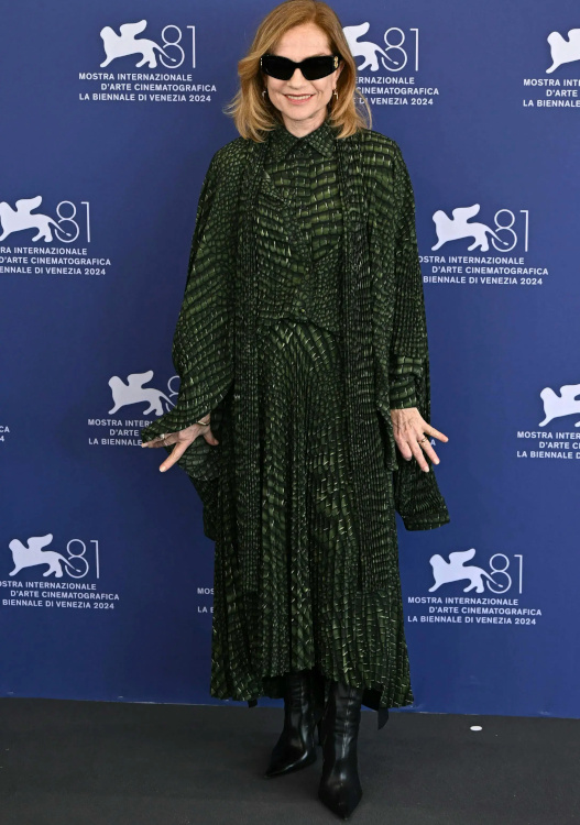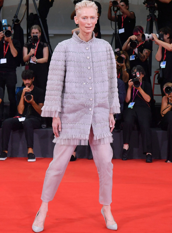 Les tapis rouges se suivent et les victimes consentantes de la maison Chanel n'en finissent pas de se multiplier… (voir ici, ici, ici, ici, ici, ici et là) Emma Corrin nous prouve que lorsqu'il se voit décliné dans un style bourgeois subtilement décalé, le vert pomme chimique n'est pas si rédhibitoire (Miu Miu). Entre néo glamour et parti pris élégamment expérimental, les toilettes immaculées de Taylor Russell font mouche (Alaïa, Loewe). Si mixer les carreaux est une bonne idée sur le papier, encore faut-il les télescoper de manière harmonieuse… (Alba Rohrwacher) Portée avec naturel, la sublime robe Dior de Camille Cottin fit oublier son austère ensemble tunique/pantalon et sa tenue mêlant volants et dentelle arborée précédemment. Évoquant le glamour des années 20, une touche de (fausse) fourrure s'invita avec plus ou moins d'à-propos sur le tapis rouge de la Mostra (Úrsula Corberò, Angelina Jolie). Isabelle Huppert prend apparemment très au sérieux son rôle d'égérie Balenciaga : l'actrice de 71 ans piocha en effet la totalité de ses looks au sein du vestiaire de la griffe (voir ici, ici, ici, ici, ici et là). Bien qu'il soit évident qu'il s'agit d'un exercice promotionnel, la complicité entre Brad Pitt et George Clooney n'en demeure pas moins jouissive à observer (voir ici).