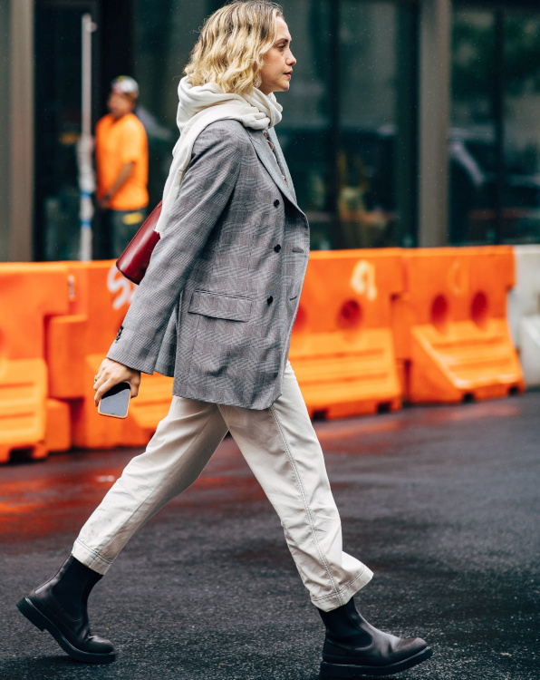 Par ailleurs, l'alliance entre le pantalon "feu de plancher" et la veste courte coupe la silhouette à trop d'endroits différents. Cela fonctionnerait beaucoup mieux avec un jean se cassant franchement sur les baskets.