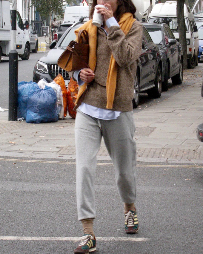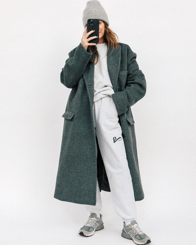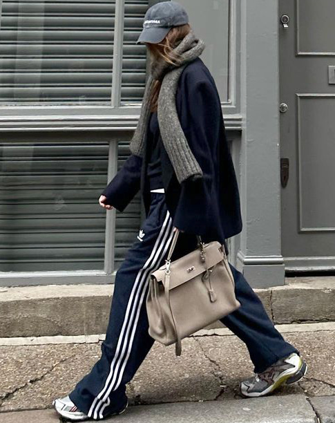 Le travailler en camaïeu de gris et relever le tout par un élément rouge (voir ici). Éviter de le porter avec des runnings ayant vraiment une dégaine de chaussures de course (voir ici). Ne pas chercher l'originalité à tout prix (entre la cape et les ballerines pointues, il faut choisir) (voir ici). Le glisser dans une paire de chaussettes à l'unique condition que l'ensemble du look fasse plus casual/citadin (voir ici et là) que 100% pyjama. Le réchauffer au creux d'un manteau 3/4 assez large (voir ici). Lui associer des vestes courtes superposées (voir ici). L'insérer au sein d'un look fleurant bon la montagne (voir ici et là). Contrebalancer l'effet "raccourci" du jogging roulotté en accentuant la verticalité de la silhouette via une écharpe portée non nouée (voir ici). Lui marier le duo sous-pull/chemise à rayures verticales (voir ici). Accompagner un jogging gris du trio sous-pull/pull col V/blazer en laine décliné dans des tonalités caramel/blanc cassé (voir ici). Travailler en duo sous-pull moulant et jogging large (voir ici). Opter pour un pardessus masculin afin de patiner la dimension sportswear de l'ensemble de jogging (voir ici). Associer manteau marron et jogging vert (voir ici).