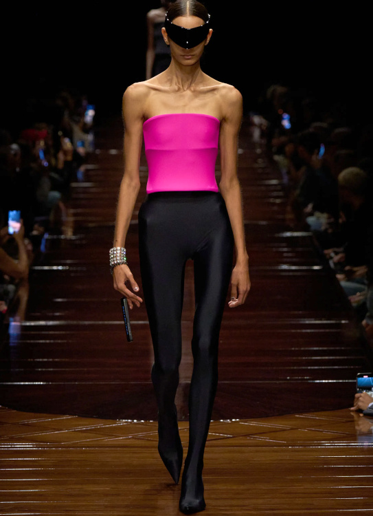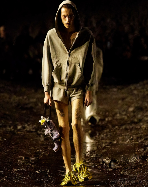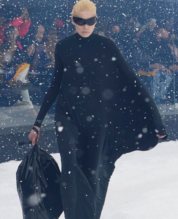 En adoptant une esthétique clivante, que ce soit dans le choix de ses mannequins, de leur maquillage ou de la démarche qui leur était imposée (voir ici, ici, ici et là), Demna Gvasalia enveloppa ses créations d'une aura sombre et pesante. Difficile en effet d'apprécier un défilé de la marque quand l'impression de regarder un énième épisode de "The Walking Dead" prédomine sur toute autre sensation. Dans ce contexte, il n'est pas surprenant que la controverse à laquelle Balenciaga a dû faire face en 2022 ait eu un tel écho, les faits reprochés à la marque résonnant étrangement avec son ambiance globale. On lui doit également des "ready-made" aussi provocants qu'impactants, à l'instar des sacs en cuir bleu rappelant étrangement les sacs Frakta de chez Ikea, des pochettes "chips Lay's" ou encore des sacs poubelles en cuir carbone. Autant d'accessoires qui permirent à la marque de se retrouver régulièrement au centre de toutes les discussions. Les dernières collections de Demna Gvasalia chez Balenciaga rendent nostalgiques de ses premiers défilés, lorsque le vêtement primait sur l'envie de déstabiliser (voir ici et là).