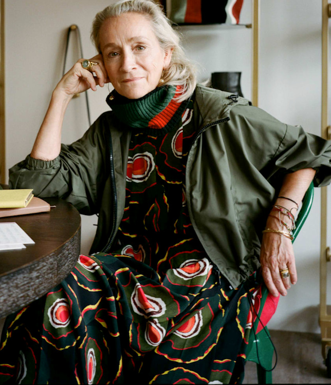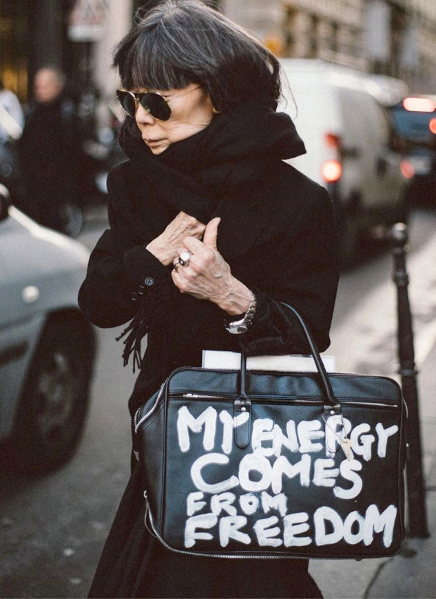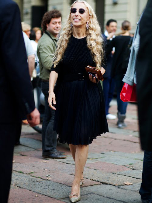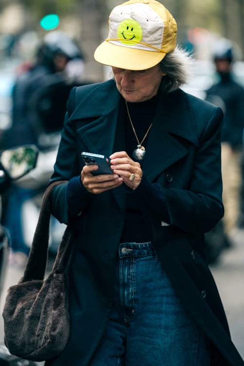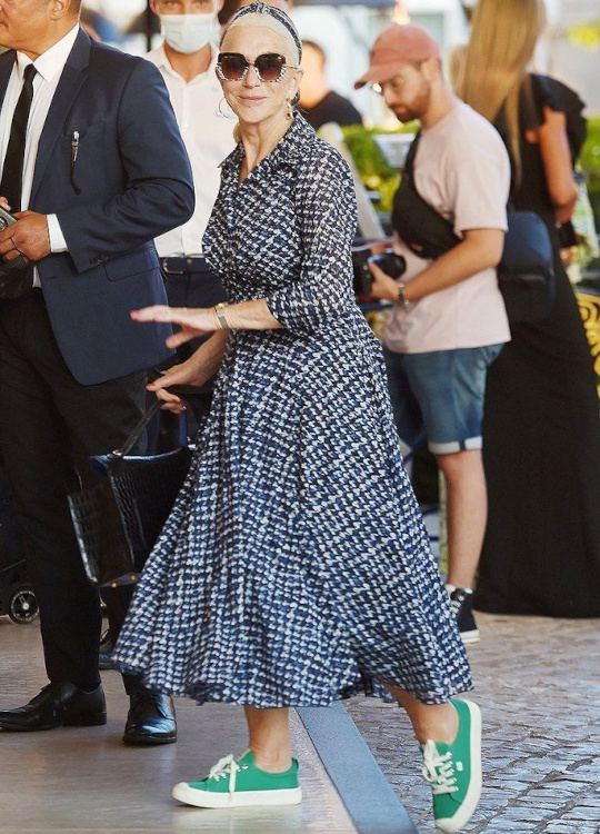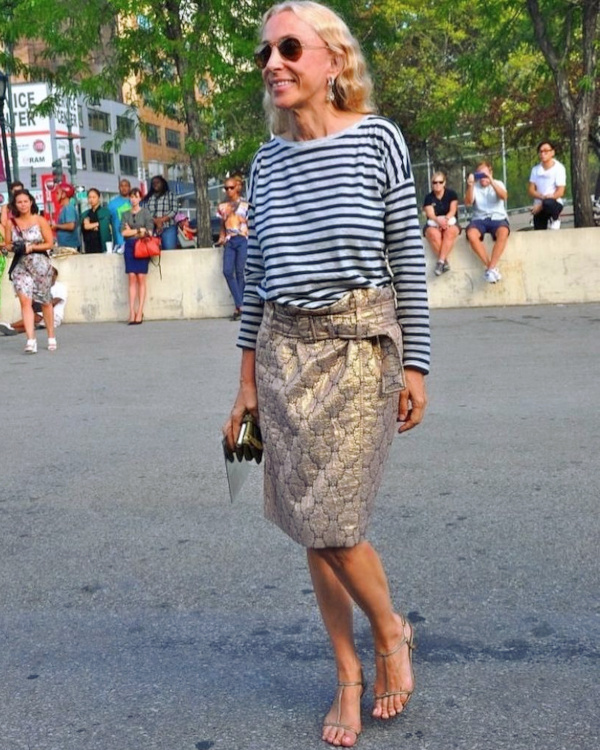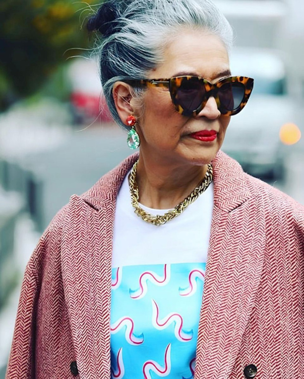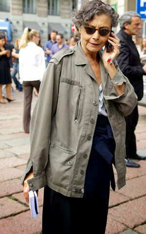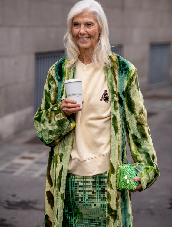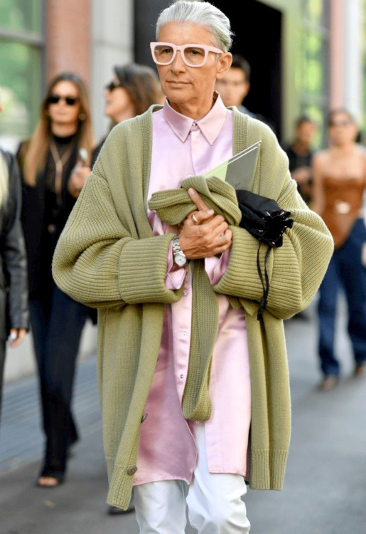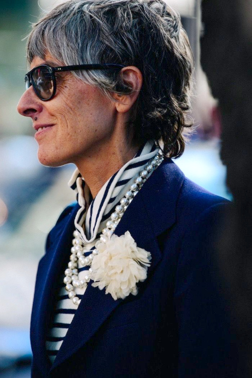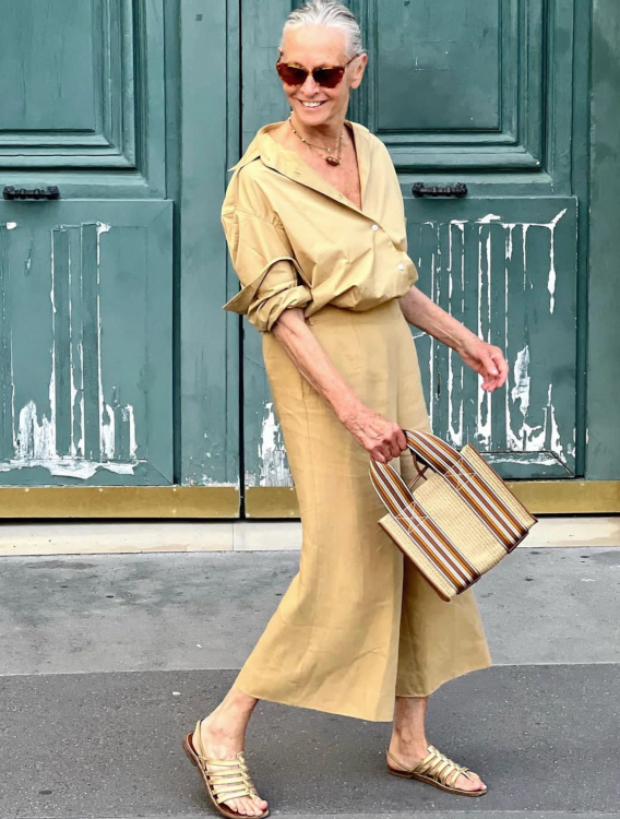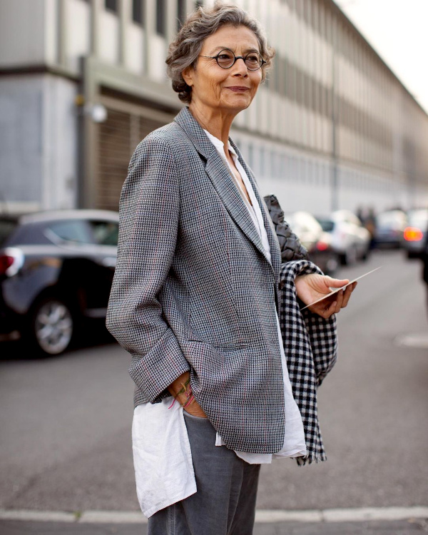 Réveiller ses manteaux sombres via une paire d'audacieuses boucles d'oreilles (voir ici). Ne pas renoncer aux éléments les plus casual/utilitaires de sa garde-robe (voir ici). Associer jupe au genou et talons fins (voir ici). Dénicher des combinaisons utilitaires colorées et bien coupées (voir ici). Booster les reflets gris de ses cheveux en portant des textures argentées (voir ici). Oser s'habiller comme un parrain de la mafia italienne (voir ici). Télescoper sweat et jupe disco (voir ici). Marier pièce classique et accessoires ostentatoires (voir ici). Jouer à télescoper matières texturées et motifs classiques (rayures, carreaux, pois…) (voir ici). Miser régulièrement sur le total look noir (voir ici, ici et là). Marier polo à manches longues et ample jupe midi dorée (voir ici).