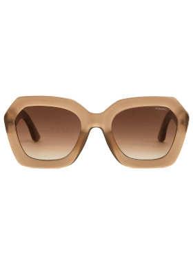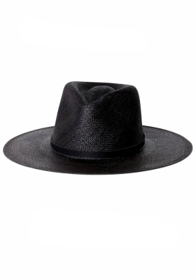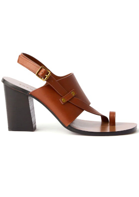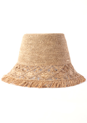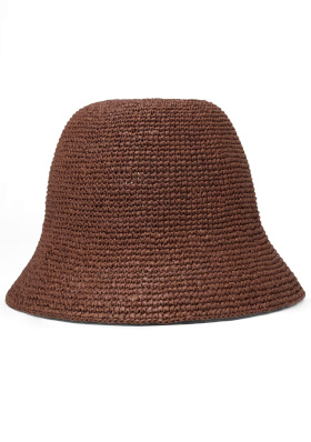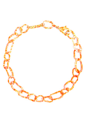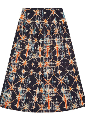 Le collier fait écho aux nuances orangées de la jupe, tandis que les fines sandales équilibrent le volume de cette dernière. La rigidité du chapeau apporte de la structure à l'ensemble.