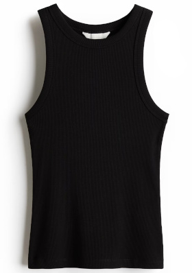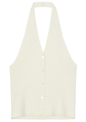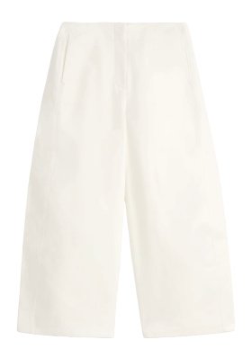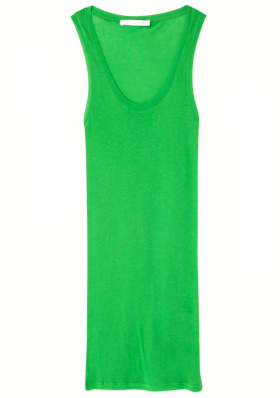 Le marcel vert injecte une énergie intense, immédiatement tempérée par la neutralité du blanc cassé du pantalon. Le sac doré et les sandales métallisées sophistiquent la silhouette sans l'alourdir. Les différentes textures en présence offrent au look du relief et de la densité. Le volume du pantalon est équilibré par le minimalisme des sandales et la coupe près du corps du débardeur.