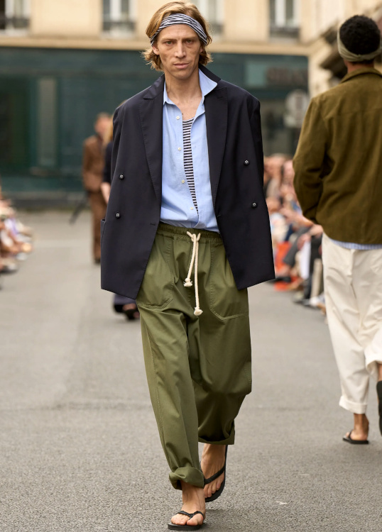 Marier tongs et sobre pantalon en toile légère roulotté sur la cheville (Officine Générale). Mixer pantalon large kaki esprit cargo, tongs, tee-shirt marinière, chemise bleu ciel et blazer (Officine Générale). Nouer un paréo sur ses pantalons de ville (Dries Van Noten). Incorporer un foulard travaillé en camaïeu au sein de ses tenues minimalistes (Dries Van Noten). Injecter une touche d'élégance exotique à la notion de smoking (on ajoutera ici un caraco noir) (Dries Van Noten). Mixer rose (pour adoucir), bleu cyan (pour dynamiser) et gris (pour équilibrer) (Willy Chavarria). Réveiller le duo blanc/kaki au contact d'une gourmande touche de rose guimauve (Dior). Exemple : + + . Associer sa chemise blanche la plus chic au duo jean large patiné par le temps/blazer esprit "gentleman farmer" (Dior). Partir en quête d'un jean vert pomme (Dior). Penser à surtailler ses bermudas et à les réchauffer via un blazer bar (Dior).