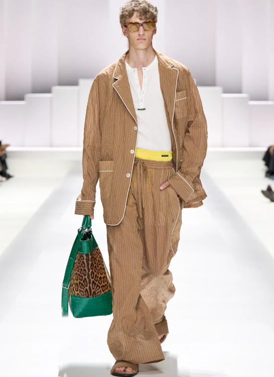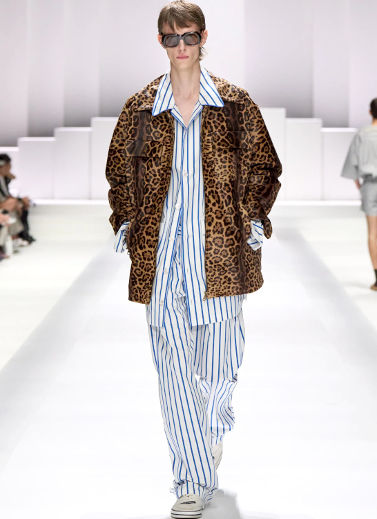 Faire du duo jaune/blanc le "game changer" chromatique des teintes marron clair (Dolce & Gabbana). Exemple : + + + . Marier encore et toujours imprimé léopard et rayures verticales bleues (Dolce & Gabbana). Exemple : + + + . Se convertir définitivement à la coupe barrel (Sacai - voir ici et là). Dénicher des versions twistées de ses classiques favoris (ici pull de montagne et pantalon chino) (Sacai). Laisser sa chance au concept de jupe-culotte (Sacai). Associer blazer long et pantalon ultra large (Sacai). Faire la part belle au vert d'eau au sein des looks safari afin d'éviter le premier degré (Saint Laurent). Insérer un élément sportswear coloré - mais parfaitement maîtrisé - au sein de ses looks citadins (Saint Laurent).