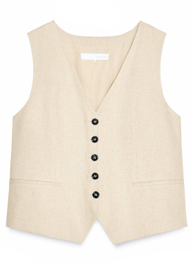 Le duo bleu marine jupe culotte/casquette crée une base sobre qui donne de la cohérence visuelle, tout en créant un esprit casual-chic. Le gilet écru casse la monochromie marine et affûte la silhouette. Le collier coloré twiste la dimension ultra sage du look en lui apportant une bonne dose de fantaisie espiègle. Les sandales orangées réveillent discrètement - mais efficacement - les teintes en présence. Chaque pièce joue sur un registre différent (sport, tailoring, fun, minimalisme), mais l'ensemble reste équilibré grâce à une palette maîtrisée et un bon jeu de proportions.