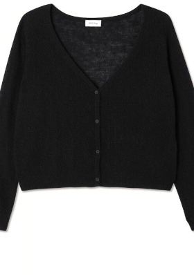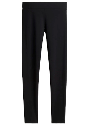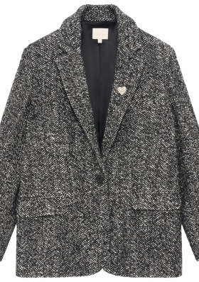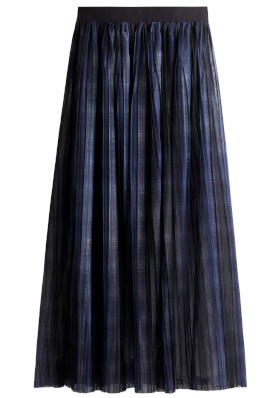 Le blazer en drap de laine contraste avec la fluidité de la jupe. Porté à même la peau sous le blazer, le cardigan noir adoucit la masculinité de ce dernier. La superposition jupe/legging noir renforce la verticalité de la silhouette et génère un effet de profondeur graphique qui permet au look de respirer en dépit d'être très couvrant.