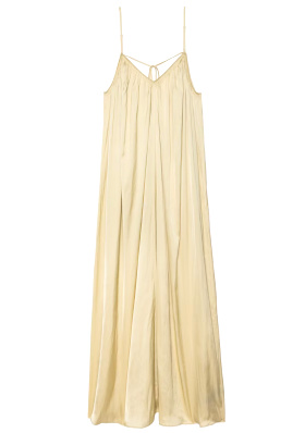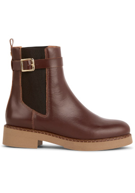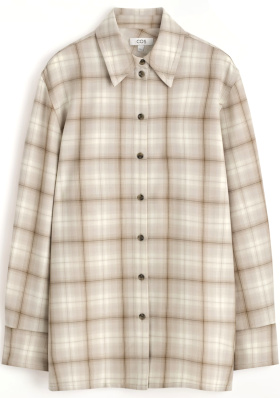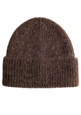 Le bonnet marron équilibre la clarté de la robe en créant un point d'ancrage au niveau du visage. Les boucles d'oreilles nacrées contrastent avec les éléments plus "campagne" du look. Porté ouvert et glissé sous la veste à carreaux, le cardigan sert de trait d'union entre la coupe structurée de cette dernière et la fluidité de la robe. Les bottines en cuir brun rappellent le bonnet par leur couleur chaude, tandis que leur semelle claire permet d'alléger le bas de la silhouette.
