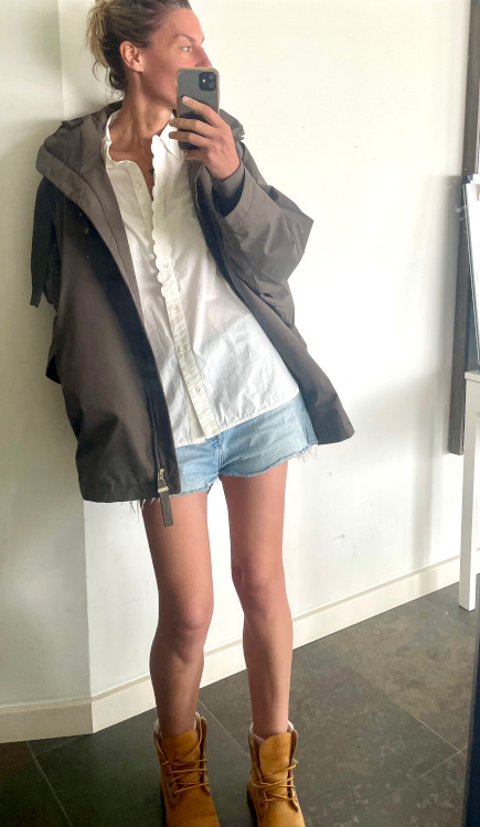 J'ai donc fini par ressortir mes Timberland canadiennes, que j'ai aujourd'hui ré-adoptées. Il faut dire qu'elles accrochent bien le sol et que leur allure fonctionne parfaitement avec mes shorts en jean, mes grosses mailles et ma parka olive. Je leur adjoins une paire de chaussettes toute douce, montant sur le mollet sans se resserrer (je marque facilement, il me faut donc des chaussettes loose), et me voilà parée !