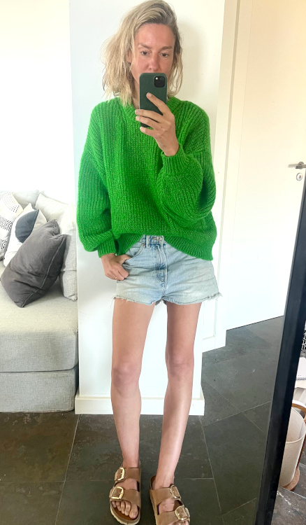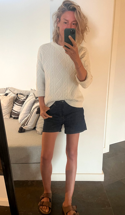 Il a beau faire grincer des dents à chaque fois que je l'arbore sur Instagram, le duo short/pull reste ma tenue préférée de mai à fin octobre. Il faut dire que dans notre coin du Portugal, il peut faire très doux jusqu'à l'arrivée de l'hiver. Dans ce contexte, ce mix est idéal : j'aime en effet la sensation du vent vivifiant sur mes jambes nues et la chaleur ouateuse de la laine sur mon buste.