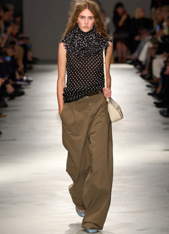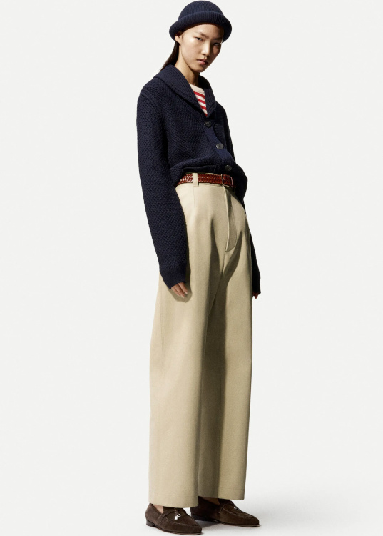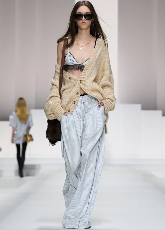 Ne pas hésiter à conjuguer pantalon large flou et maille nonchalante (Dolce & Gabbana). Mise en pratique : Mixer pantalon large ultra fluide, sous-pull et gilet col châle.