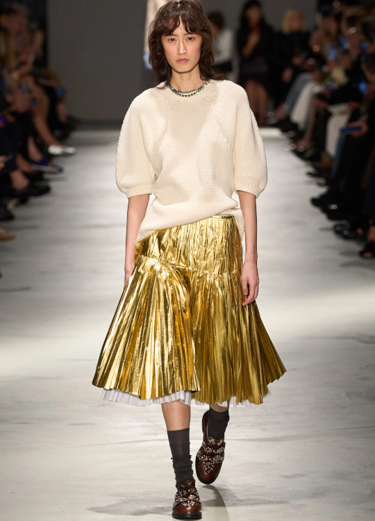 Patiner l'éclat métallisé d'une texture dorée au contact d'une maille blanc cassé épaisse et mate (No. 21). Mise en pratique : Porter un avec une , une mini jupe en cuir ou un sac doré.