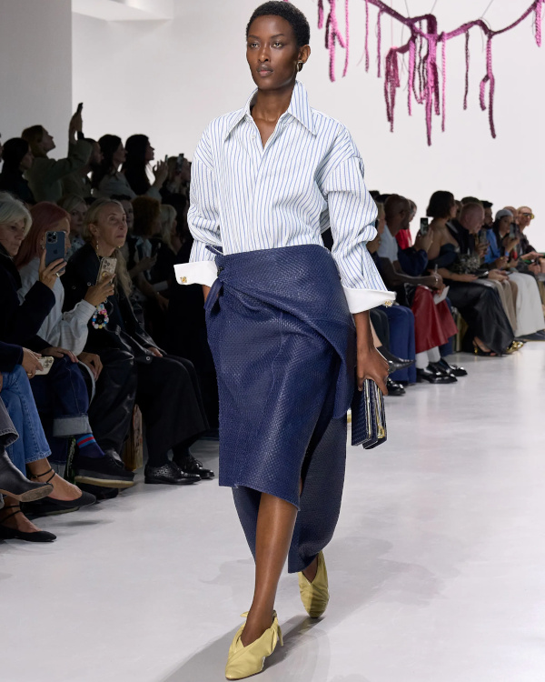 Télescoper la rigueur masculine d'une chemise à rayures verticales à la féminité audacieuse d'une jupe asymétrique (Bottega Veneta). Mise en pratique : Apaiser ses jupes midi ou asymétriques les plus folles via une chemise à rayures.