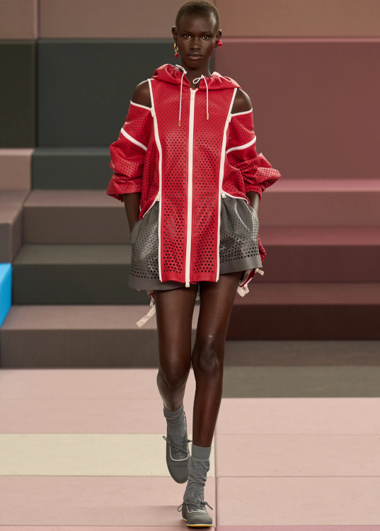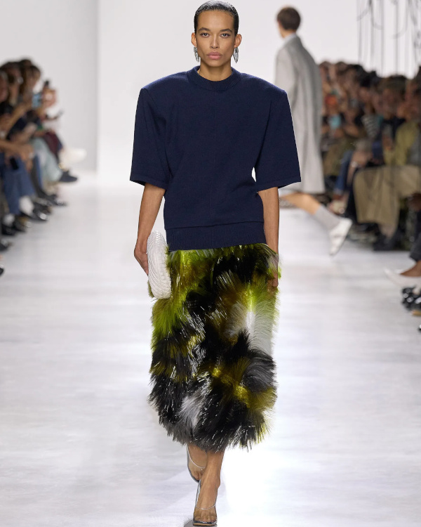 Associer sweat sportswear et texture glamour/festive (Bottega Veneta). Mise en pratique : Surmonter d'un ses jupes à sequins, à plumes ou autres.