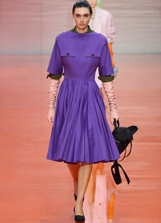 Marier violet, kaki et rose pâle (Prada). Mise en pratique : Mixer pantalon large kaki, , débardeur blanc, bague rose et baskets blanches.
