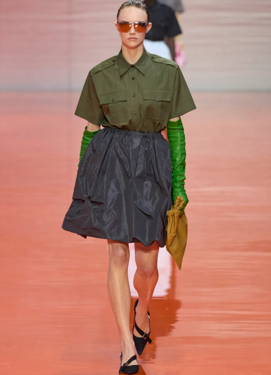 Réveiller le kaki en lui associant du vert gazon (Prada). Mise en pratique : Apposer une ceinture vert gazon sur une combinaison pantalon kaki.