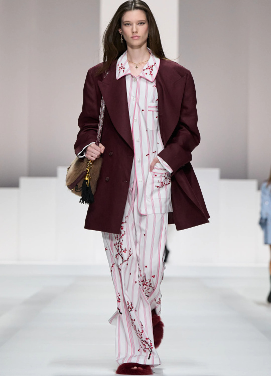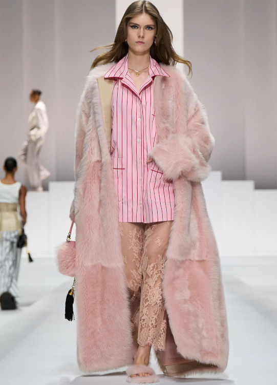 Injecter une note espiègle à la sévérité du gris via une touche de rose Malabar (Fendi). Mise en pratique : Miser sur des accessoires rose pour égayer des pièces fortes grises ( + ou robe grise + escarpins rose).