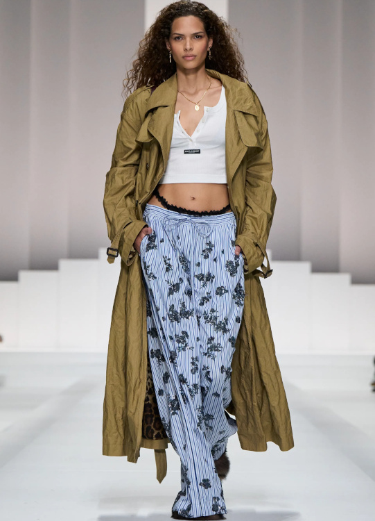 Associer trench olive et rayures bleu ciel (Dolce & Gabbana).