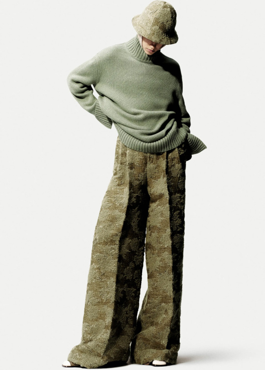 Rechercher des motifs évoquant avec subtilité l'effet camouflage afin de les travailler en camaïeu avec d'autres teintes lichen/kaki (Loro Piana).