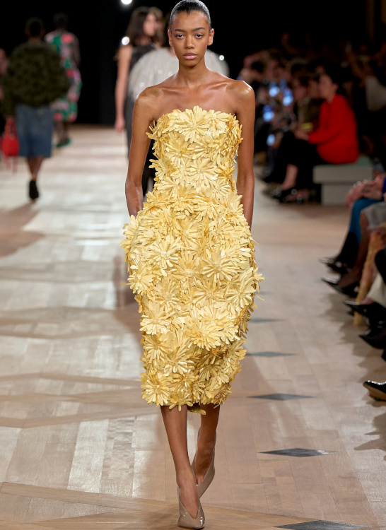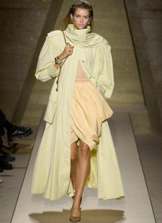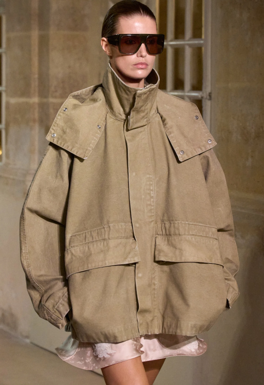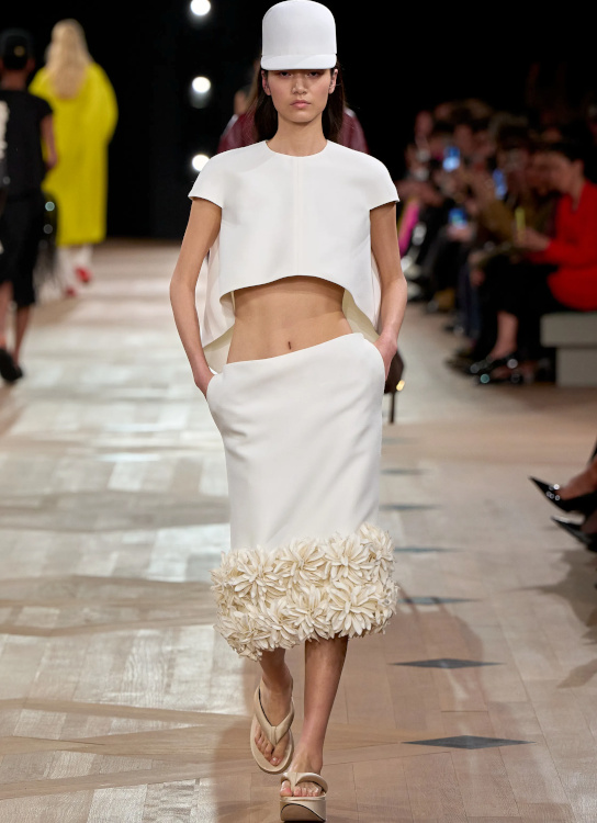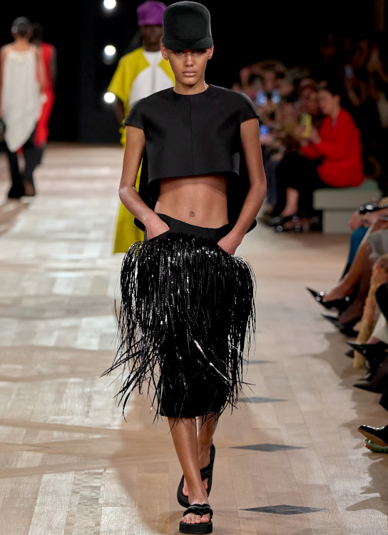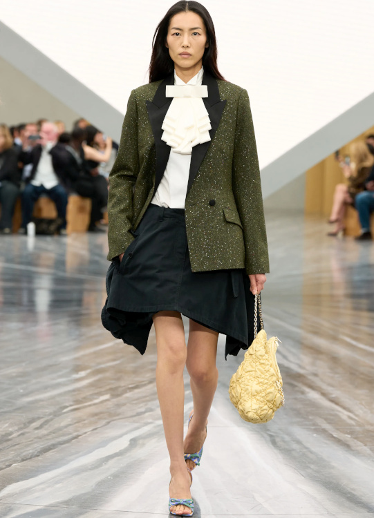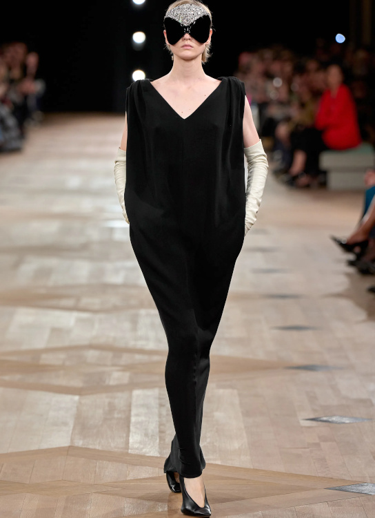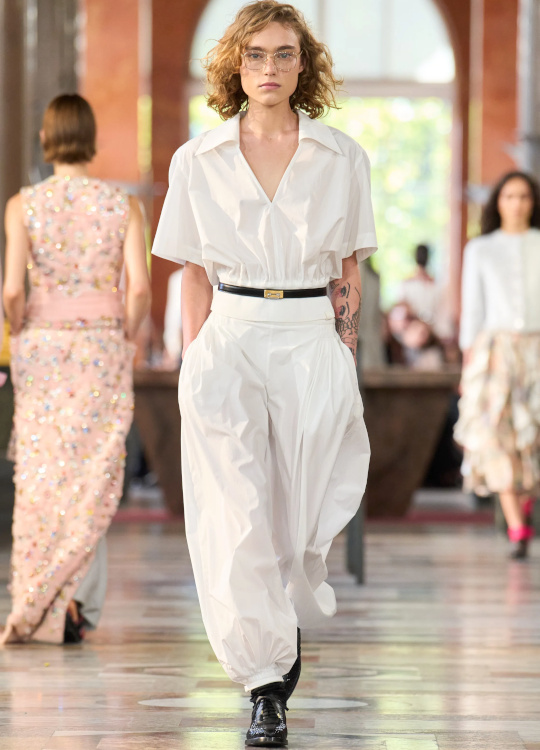 Si elle s'avère moins percutante que l'opus masculin, la première collection Dior femme signée Jonathan Anderson n'en demeure pas moins prometteuse. Le créateur de 40 ans prouve en effet qu'il ne se laisse pas intimider par le poids de l'héritage Dior en nous en livrant une lecture personnelle, nourrie de sa propre grammaire stylistique (voir ici, ici et là). La partition est encore hésitante (voir ici, ici et là) et l'équilibre entre audace, casualness, désirabilité immédiate et aventure cérébrale reste à affiner, mais les fondations sont là. Au final, mon envie de voir s'épanouir la femme Dior selon Jonathan Anderson n'a jamais été aussi vive : l'homme qui imagina la robe du passage 33 (voir ici et là) ne peut en effet qu'être capable du meilleur… Faussement simple, le duo blouson légèrement oversize + mini-jupe rose layette fait mouche chez Victoria Beckham (voir ici). Je me demande si Rick Owens, Duran Lantink et Glenn Martens ont fréquenté le même pensionnat cauchemardesque, s'ils participent à des réunions occultes dans les catacombes et s'ils mangent des oisillons morts au petit-déjeuner. Difficile en effet d'expliquer autrement la teneur de leurs collections respectives… (voir ici, ici et là) Stella McCartney nous prouve qu'il suffit de peu de choses pour transformer un "no look" en silhouette impactante (voir ici). Heureuse de retrouver chez Loewe les créateurs Jack McCollough et Lazaro Hernandez qui, après m'avoir cruellement laissés sur ma faim lors des dernières collections Proenza Schouler, semblent avoir récemment ingurgité un élixir de jouvence créatif (voir ici, ici et là).
