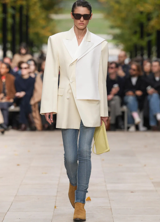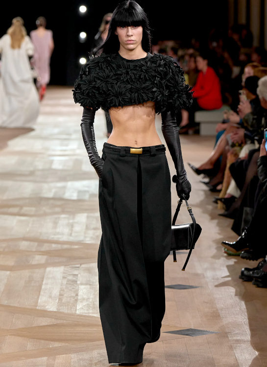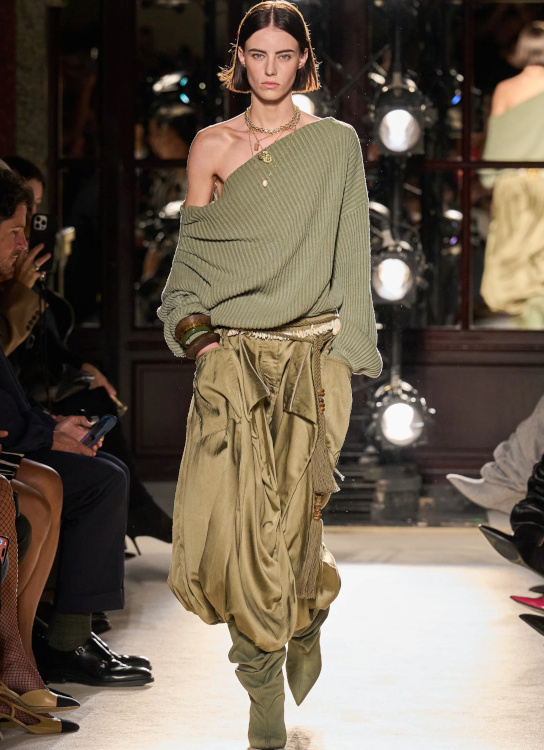 Seul bémol : l'omniprésence des longueurs cropped (voir ici et là), qui impliquent de remplacer nos visites quotidiennes à la boulangerie par un abonnement à la salle de sport. Chez Vêtements, difficile de penser que les pleurs d'Anok Yai n'étaient pas scénarisés. Il y a en effet fort à parier que Demna ait cherché à reproduire le coup d'éclat de 2024, lorsque la mannequin avait quitté - spontanément - le podium en courant. Isabel Marant n'est pas venue saluer à la fin du défilé de sa marque éponyme, signifiant ainsi qu'elle passe officiellement le flambeau à son associée Kim Bekker. Reste à espérer que cette dernière parviendra à insuffler une dose de nouveauté à l'ADN de la maison, sous peine de nous faire périr d'ennui… (voir ici, ici et là)