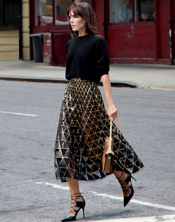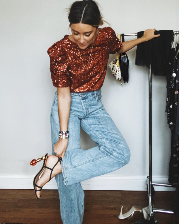 On pourra ainsi : Tempérer l'éclat scintillant d'un pantalon à sequins en lui associant un pull fin tout simple (voir ici). S'autoriser à porter des plumes en touches, en bordures de manches de robe ou de pyjama chic. Si elles sont accompagnées de bonne humeur, ces dernières confèreront à coup sûr une divine légèreté à la silhouette (voir ici). Ne pas hésiter à traiter son jean fétiche (celui dans lequel on sent aussi belle que confortable) comme un sapin de Noël à part entière en le saturant d'éléments brillants (voir ici et là). Accompagner d'un top minimaliste sobrissime le duo jupe midi ultra sophistiquée/talons de 12 cm (voir ici). Allier fragilité festive et douceur réconfortante en mariant jupon diaphane et épais pull-over, et en misant sur un camaïeu de teintes pour harmoniser l'ensemble (voir ici). Penser à organiser un "speed-dating" entre sa jupe droite à sequins et la chemise à carreaux de son mari : si celles-ci évoluent dans le même champ chromatique, il y a de fortes chances que l'issue du rendez-vous soit heureuse (voir ici). Oser le vert scintillant que l'on apaisera via une coiffure simple et un quasi no make-up (voir ici). Aller vers des robes à sequins de coupes sages, leur parure se suffisant largement à elle-même pour égayer la silhouette (voir ici). Saupoudrer de "casualness" chaleureuse le trio coiffure soignée/rouge à lèvres/boucles d'oreilles en lui associant un généreux pull col roulé bleu marine (voir ici). Miser sur une barrette (ou plusieurs) de caractère afin de pouvoir faire extrêmement simple sur le reste du look (voir ici et là). Dénicher son jupon le plus ample et le plus féminin et le réchauffer au creux d'un pull fleurant bon les montagnes islandaises (voir ici). Se servir du blazer noir pour patiner ses pièces les plus extravagantes (voir ici). Réserver le trio micro jupe/veste cropped/collants pailletés à celles officiant sur OnlyFans (voir ici).