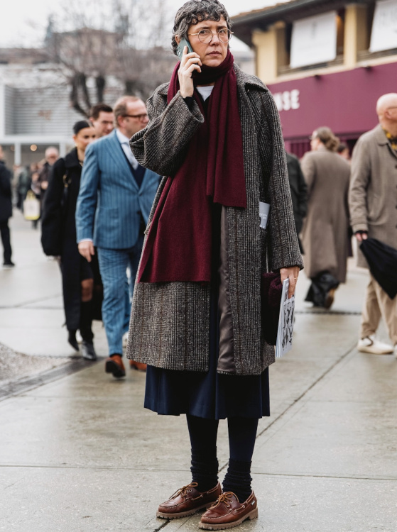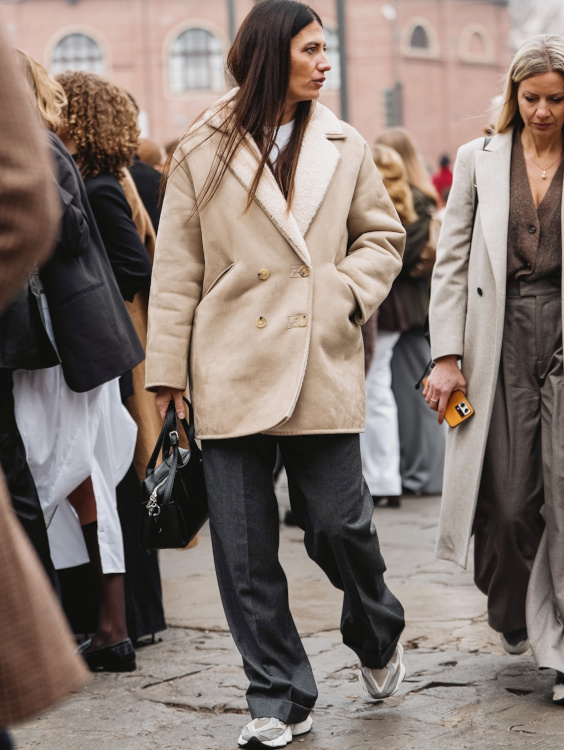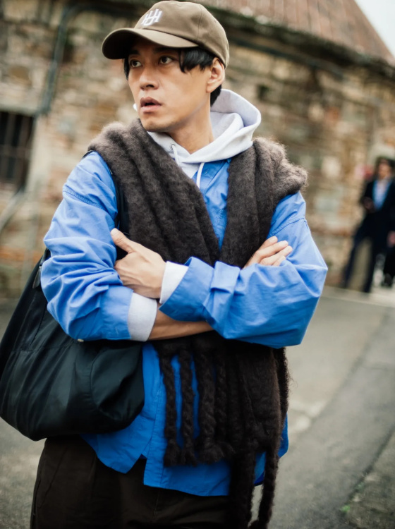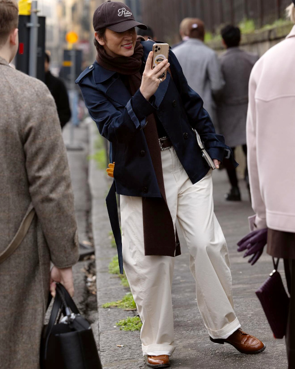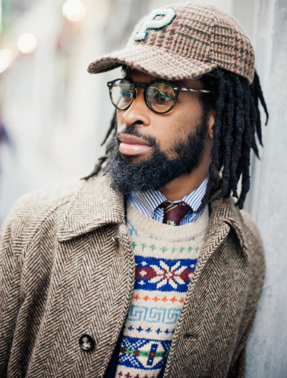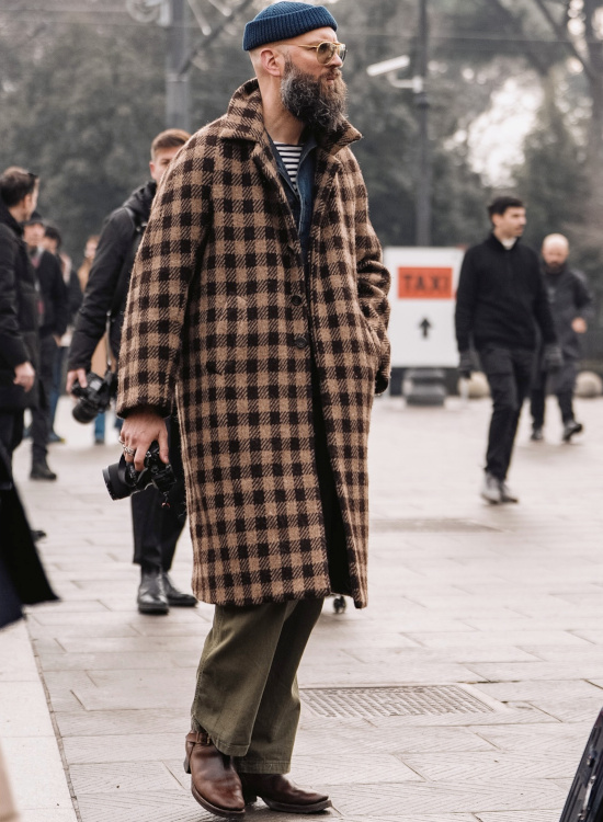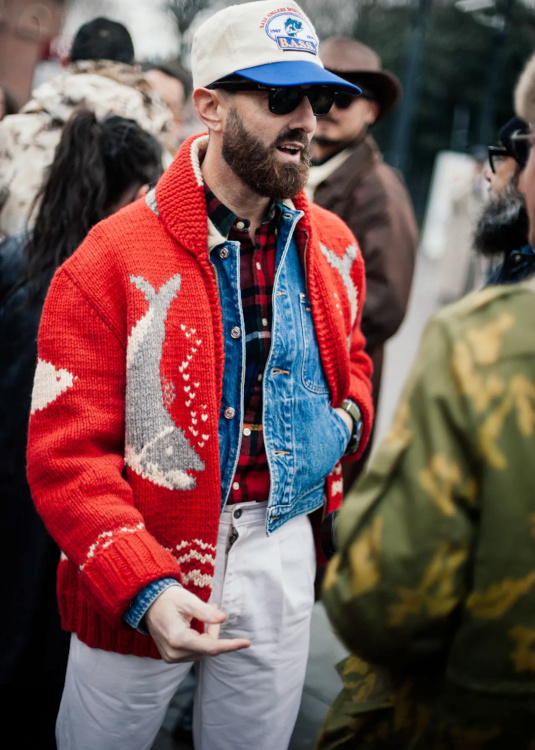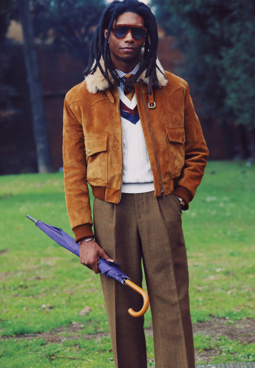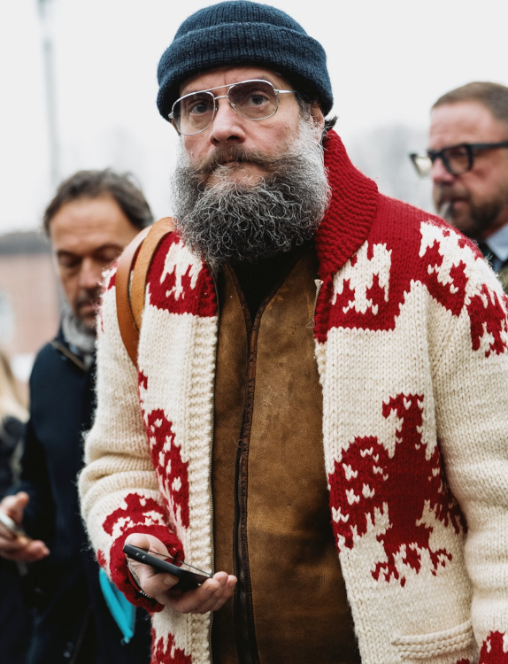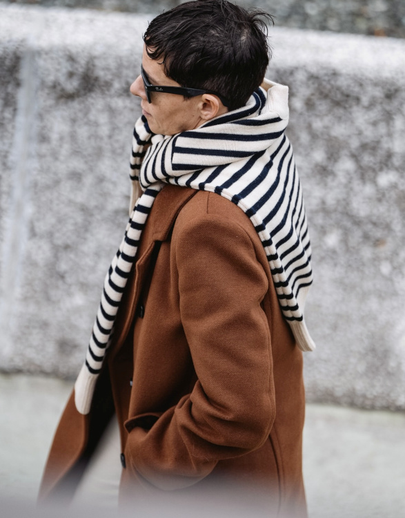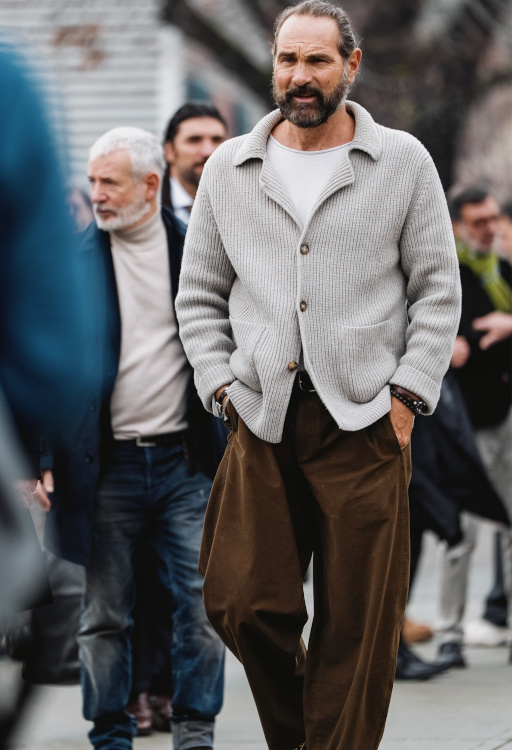 Laisser ses bas de pantalon s'accrocher négligemment sur l'arrière de ses chelsea boots (voir ici). Ne jamais cesser d'arpenter les friperies afin d'y trouver des pièces alliant caractère et confort (voir ici). Associer kaki, carreaux marron et rayures marinière (voir ici). Look reprenant cette idée : cette veste + cette marinière + . Troquer sa veste en jean contre un cardigan Cowichan, à savoir un gilet traditionnellement tricoté à la main par les peuples Coast Salish de Colombie-Britannique (voir ici et là). Sa laine non traitée isole particulièrement bien du froid et de l'humidité. Réussir à faire oublier la dimension potentiellement vulgaire des Uggs en les insérant au sein d'un look citadin construit autour d'un camaïeu de teintes camel et taupe (voir ici). Rehausser l'éclat du camel via une touche de vert émeraude (voir ici). Associer veste en peau lainée, pantalon de costume et runnings (voir ici). Mixer blouson boxy et pantalon ample, voire bouffant (voir ici). Marier la froideur d'un bleu grisé avec la chaleur du marron (voir ici). Rehausser d'une pointe de violet - ici via un parapluie - le duo fauve/marron (voir ici). Mixer gris perle, rouge et marron (voir ici). Look reprenant cette idée : + + cette casquette. Relever le tandem blazer bleu marine/chemise en jean via une très fine chaînette dorée (voir ici).