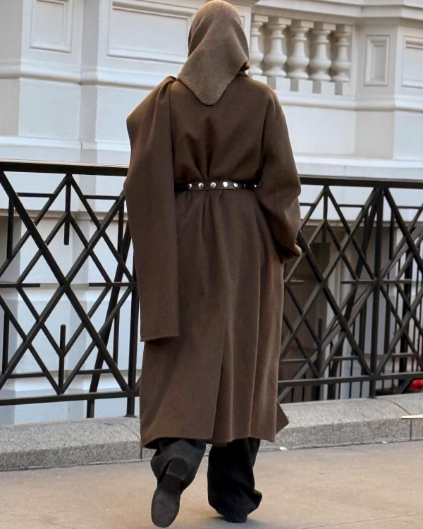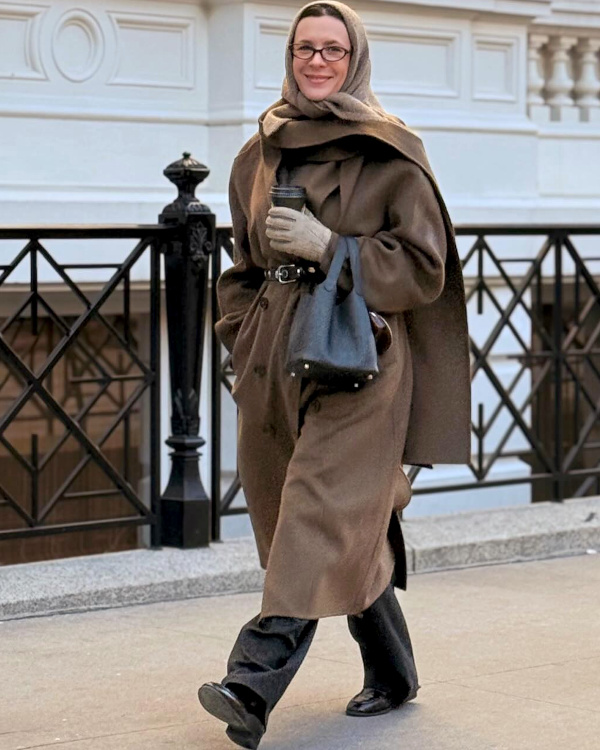 L'ensemble manteau long, pantalon sombre et chaussures plates manque de respiration : la silhouette forme un bloc continu. Le ceinturage du manteau accentue sa pesanteur au lieu de le structurer. Le fichu est traité de manière trop littérale, sans détournement, ce qui vieillit immédiatement l'allure. Il manque un détail capable de réveiller l'ensemble. On pourrait ainsi remplacer le fichu par un bonnet étirant la silhouette vers le haut, ajouter afin de structurer le buste, retrousser légèrement le pantalon à la cheville et opter pour , capables d'ancrer visuellement la silhouette.