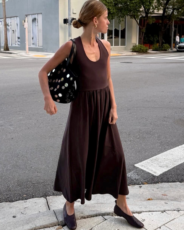 Les chaussures sont trop fermées : elles bloquent la ligne de fuite de la silhouette et la raccourcissent. Avec une robe fluide, il faudrait soit des sandales très légères, soit au contraire des chaussures nettement plus massives. Pas un entre-deux. La longueur de la robe pose problème : elle se situe dans une zone indécise, ni assez courte pour dégager la jambe, ni assez longue pour créer une vraie verticalité. Le sac est visuellement trop lourd et écrase le haut du corps. Un chignon plus haut aurait permis d'élancer la silhouette. Une matière plus noble, capable de mieux valoriser le marron, ainsi qu'une taille mieux positionnée - soit légèrement descendue, soit clairement plus haute pour tendre vers une coupe empire - auraient également amélioré l'ensemble. Enfin, un sac plus petit et choisi dans une matière plus texturée - - aurait contribué à alléger et à structurer la silhouette.