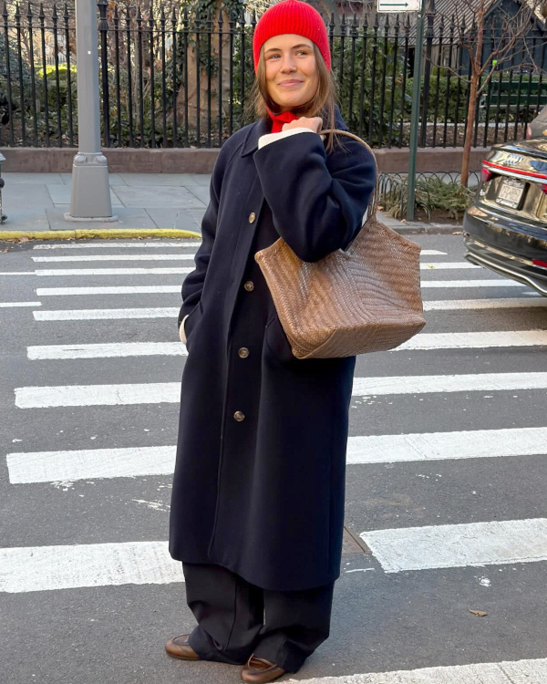 Le manteau forme un long rectangle qui engloutit celle qui le porte. Cet effet est accentué par l'absence de contraste de tonalité avec le pantalon : le rectangle se prolonge vers le bas et donne une impression d'étouffement. Le pantalon s'écrase sur une chaussure qui n'a ni la structure ni le volume pour le soutenir. Elle ne permet pas d'ancrer la silhouette au sol, contrairement à ce qu'aurait pu apporter une paire de Paraboots. Le choix d'un sac à connotation estivale est intéressant sur le papier, mais ici cela ne fonctionne pas. Le tressage crée un volume rigide placé au milieu du corps, ce qui ajoute de la masse là où il faudrait alléger. Il contribue donc à alourdir encore la silhouette. Enfin, le bonnet rouge, pourtant très joli en soi, aplatit la tête et participe à l'effet général de tassement. Un bonnet plus élancé, travaillant la verticalité vers le haut, aurait été nettement plus flatteur.