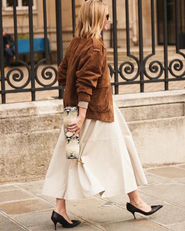 Le mix veste fauve/jupe blanche. L'énergie féminine urbaine du look.