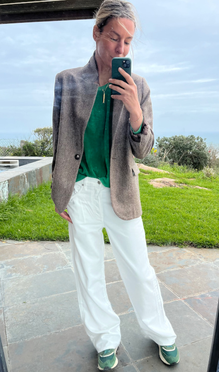 L'absence de ceinture affaiblit la silhouette. Le pantalon est assez mou et manque de tenue : une ceinture dans la teinte du blazer aurait permis de structurer la taille. La matière du sweat est trop légère. Elle s'écrase sous le blazer au lieu de dialoguer avec lui. aurait mieux répondu à la texture du blazer. Les baskets accentuent la dimension nonchalante du jean sans lui apporter de valeur ajoutée. Elles isolent le blazer. , légèrement massive, aurait fait écho à sa structure et rééquilibré l'ensemble.